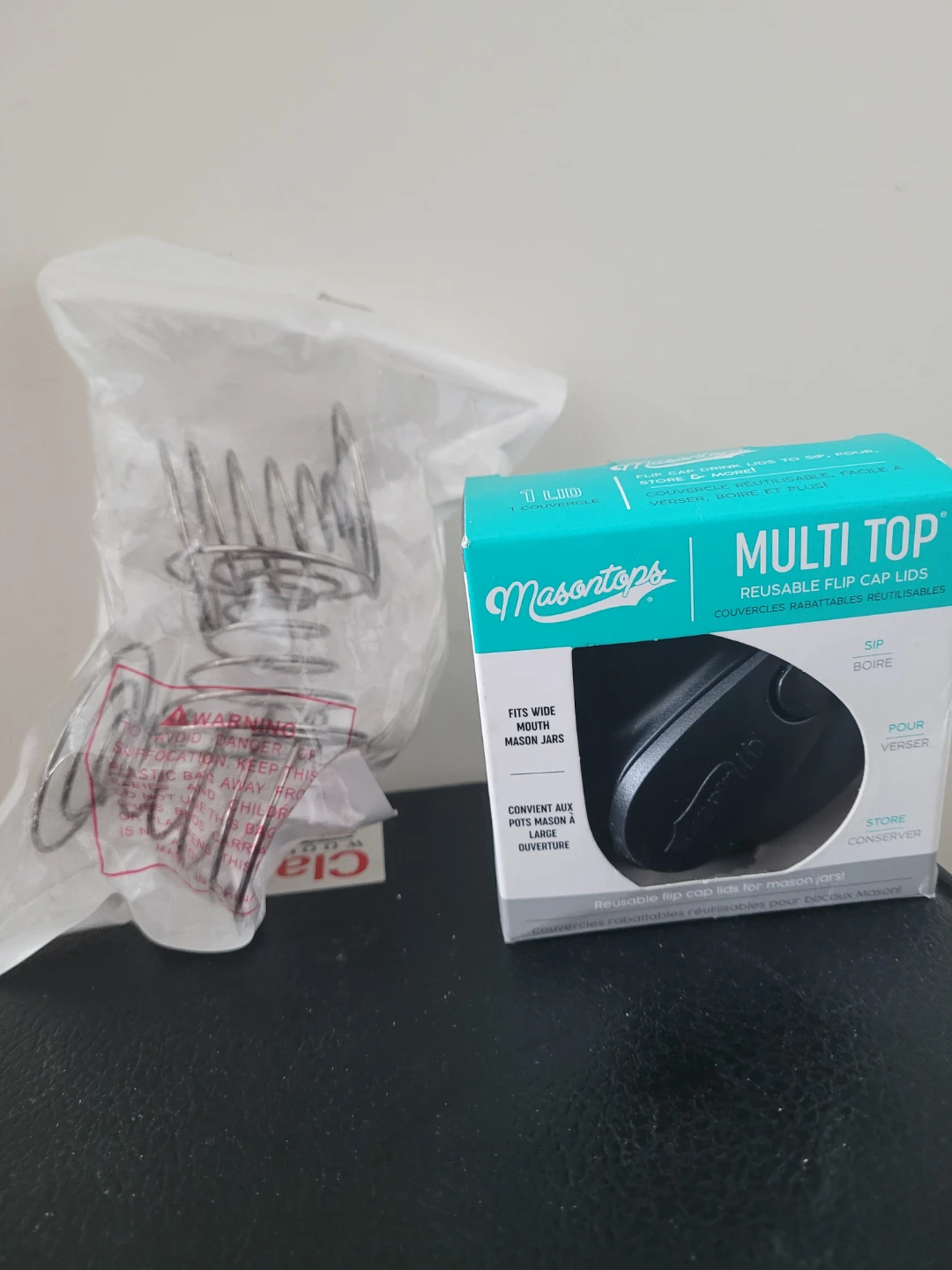 Selling a package of Masontops Multi Top reusable flip cap lid and metal blender tool for mason jars! They're designed to fit wide mouth mason jars. These lids are great for sipping, pouring, storing, and more! They're also reusable and easy to pour and drink from.