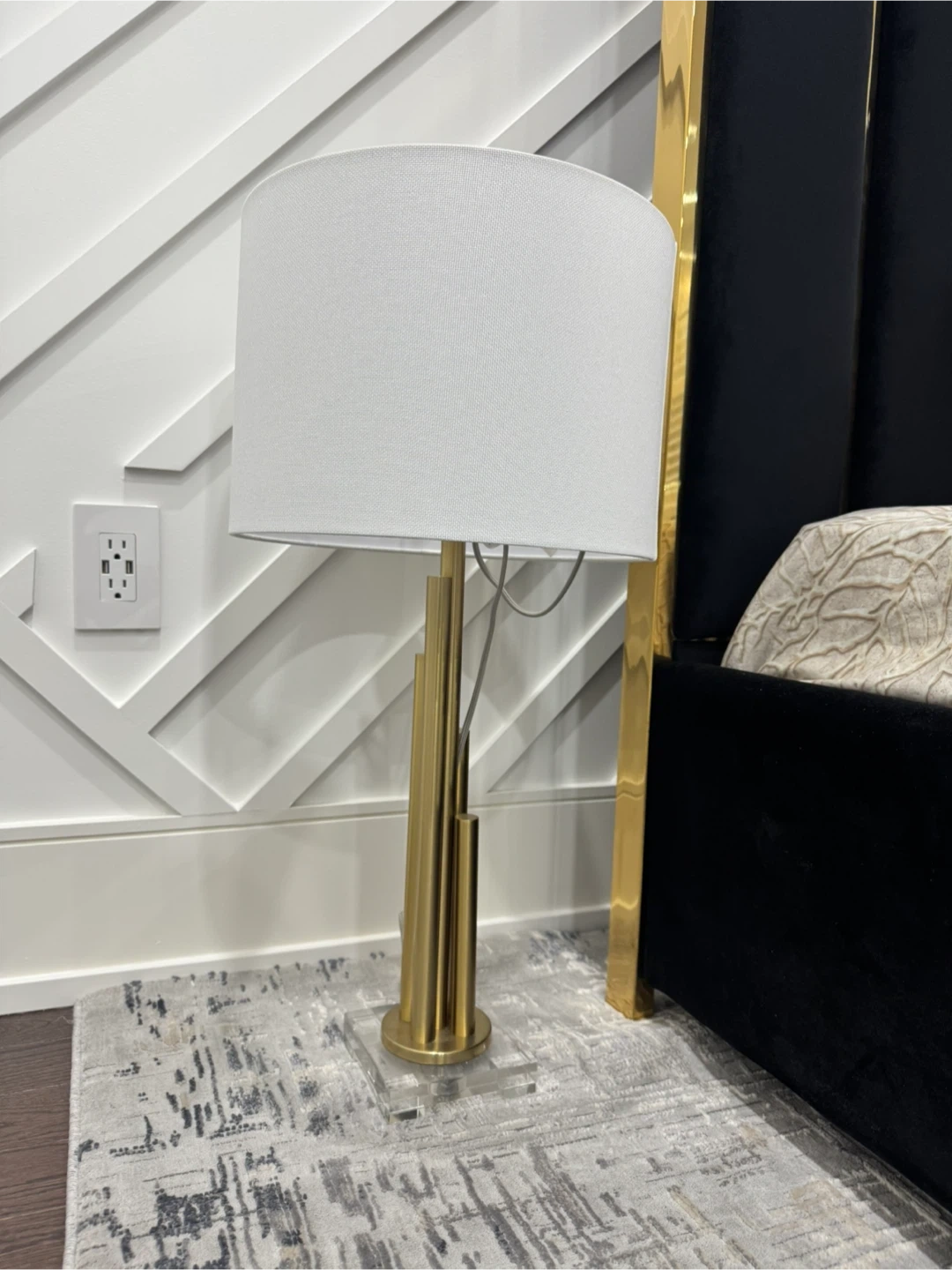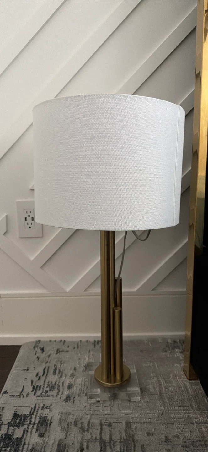 Selling a stylish gold accent table lamp. It features a sleek design with a white shade and a glass-finished base. Very modern and elegant