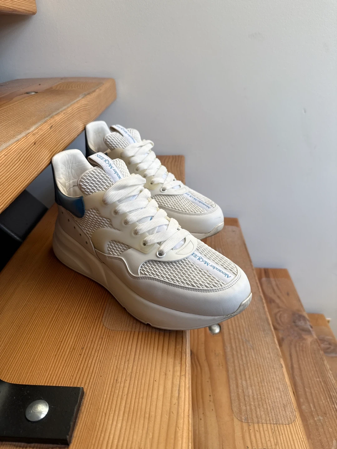 Selling a pair of Alexander McQueen Runner Sneakers in white and lake blue! These sneakers are in great condition and ready for a new owner. They're a stylish and comfortable choice for everyday wear!