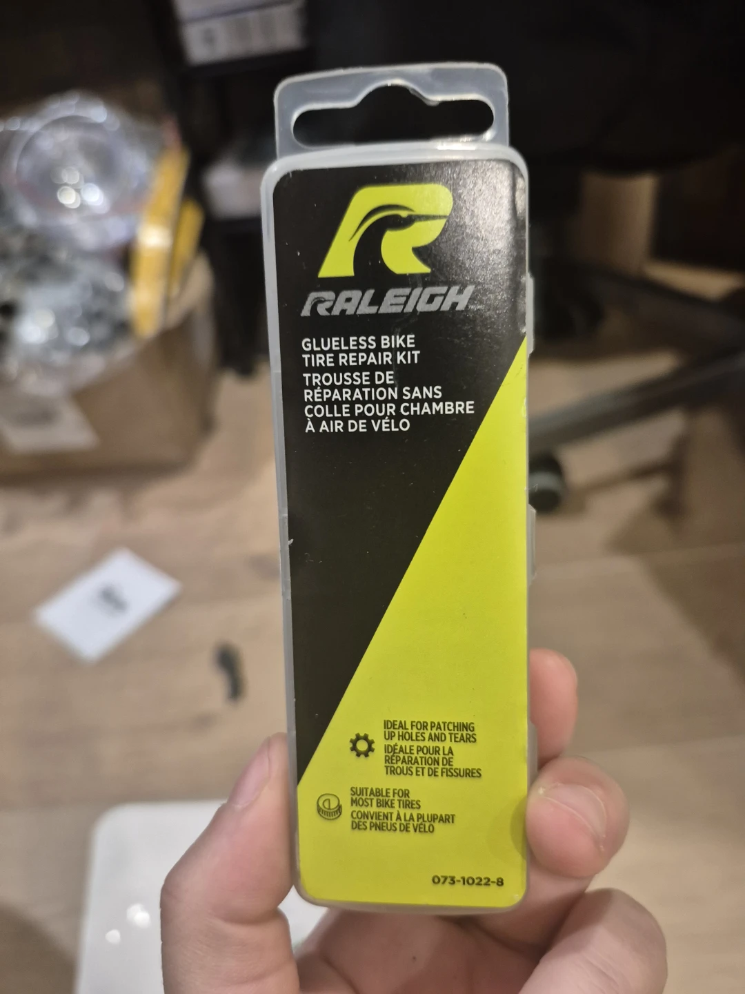 Selling a brand new Raleigh Glueless Bike Tire Repair Kit! It includes 2 square glueless patches, 6 round glueless patches, 2 tire levers, 1 grinder, and 1 plastic box. Perfect for patching up holes and tears on most tires. Great to have on hand for any bike ride!