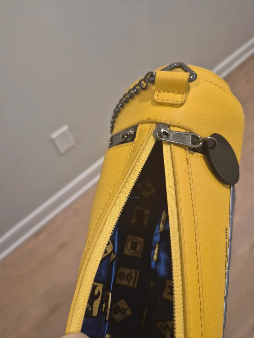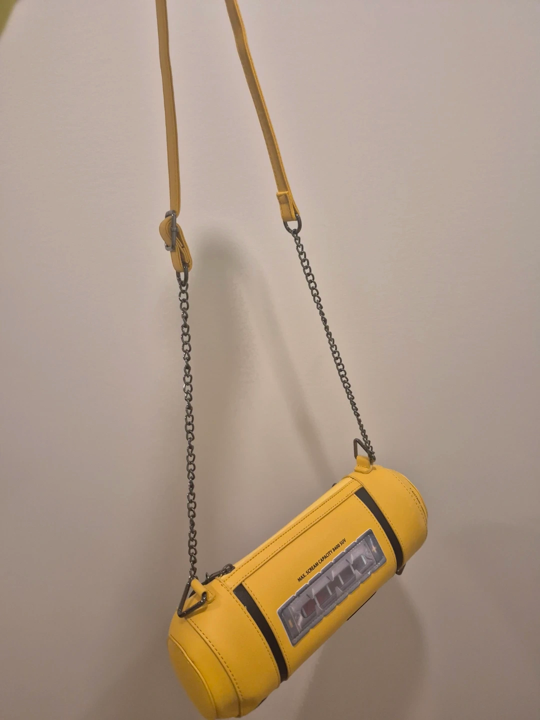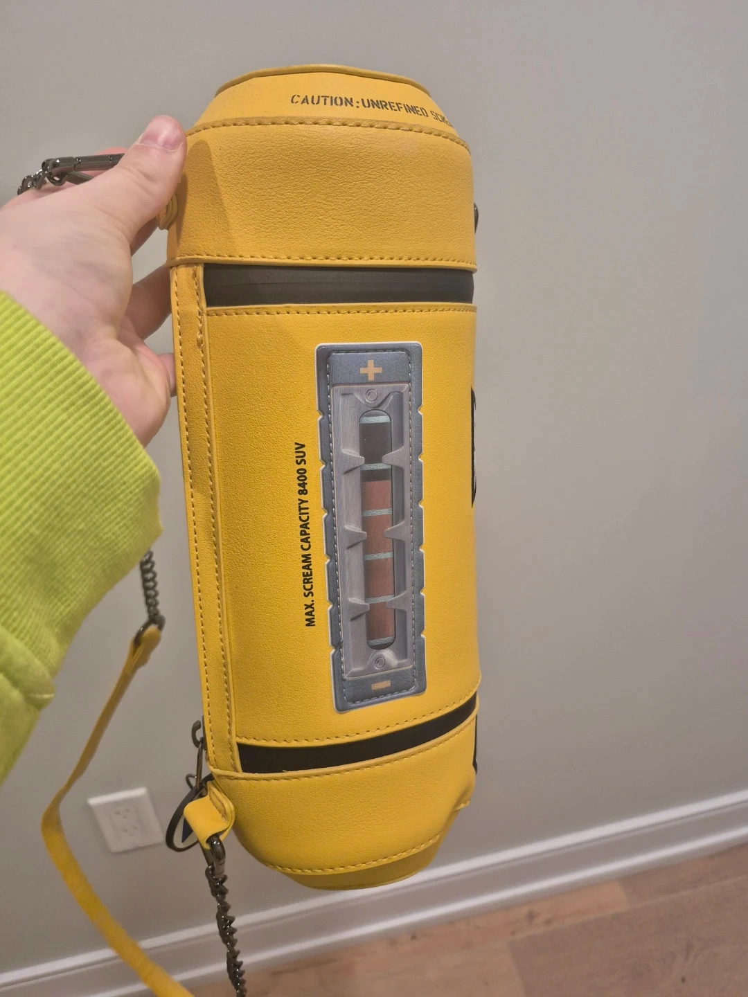 Selling a cute Scream Canister handbag. It's a bright yellow colour with a chain strap. The side of the bag says, 'MAX. SCREAM CAPACITY 8400 SUV' and 'CAUTION: UNREFINED SCREAM'. It also has the Monsters, Inc logo on the side. Selling due to being too small to fit my phone 🥲