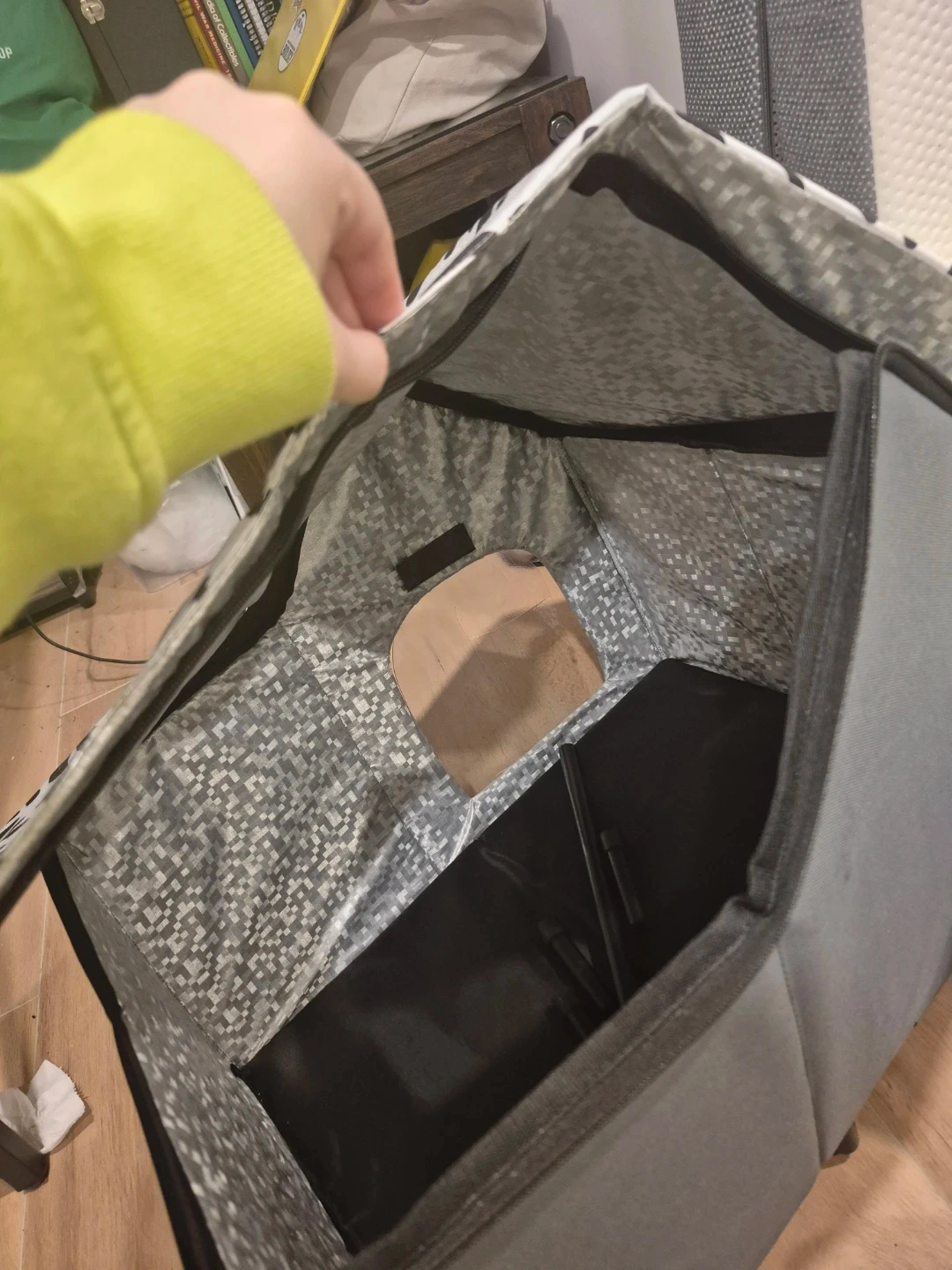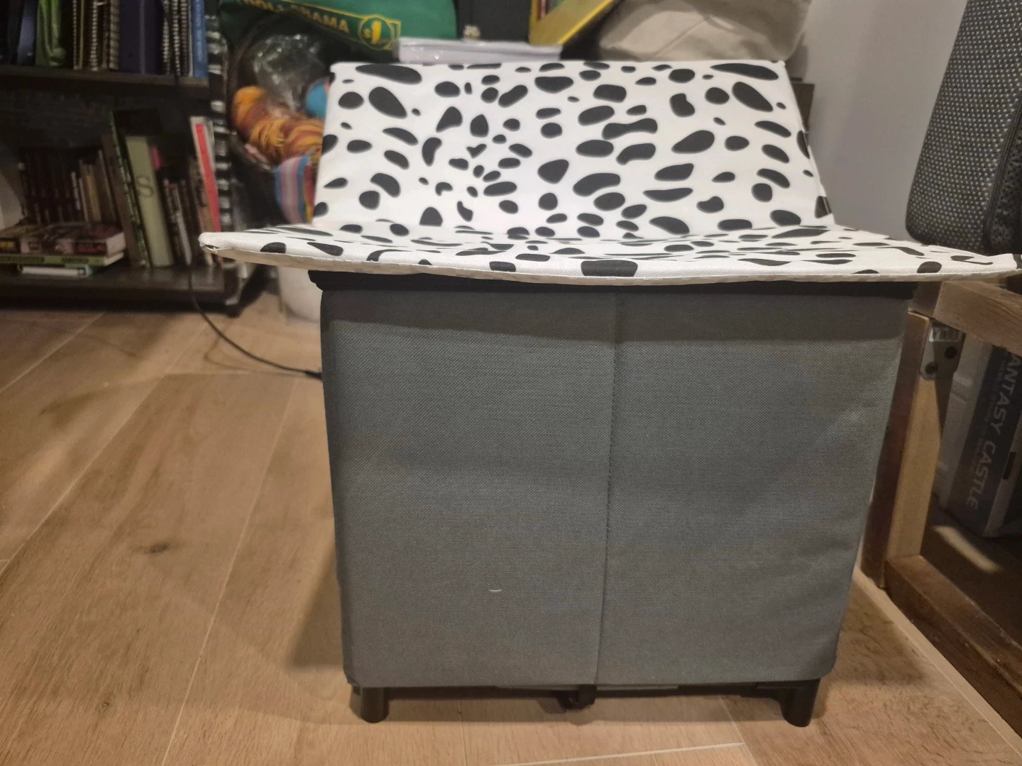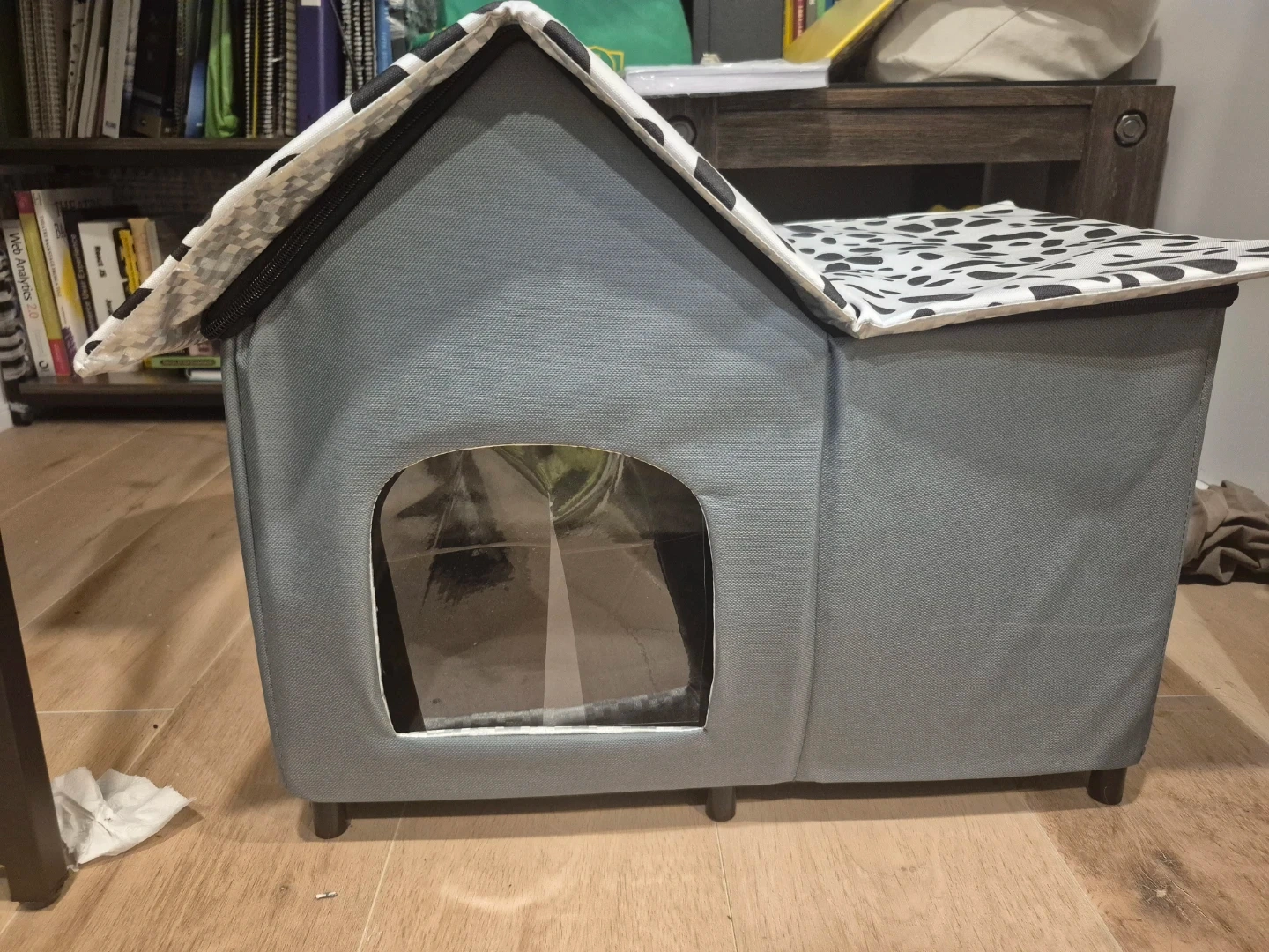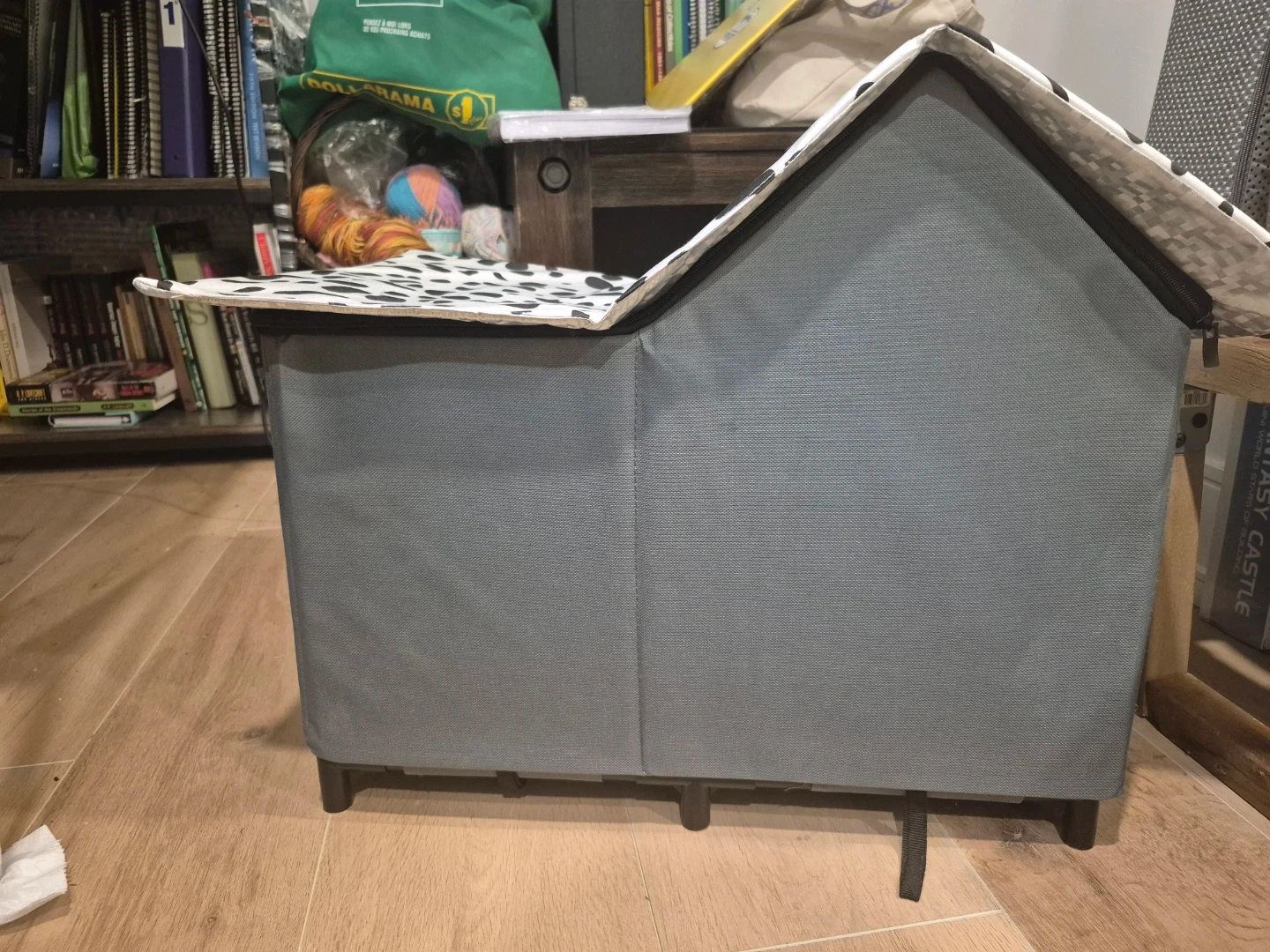 Here's a cozy dog house! It's grey with a cute Dalmatian print roof. The roof has a zipper, so you can easily remove it if you want to. It unfortunately never had a resident, so it is scent and fur free.