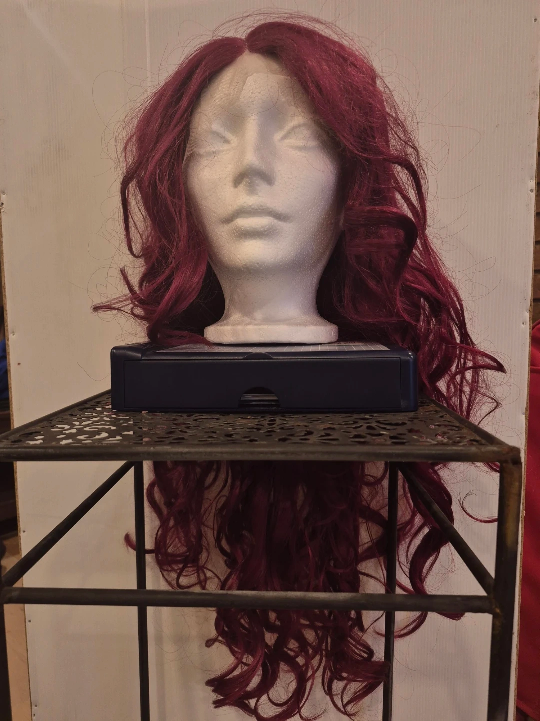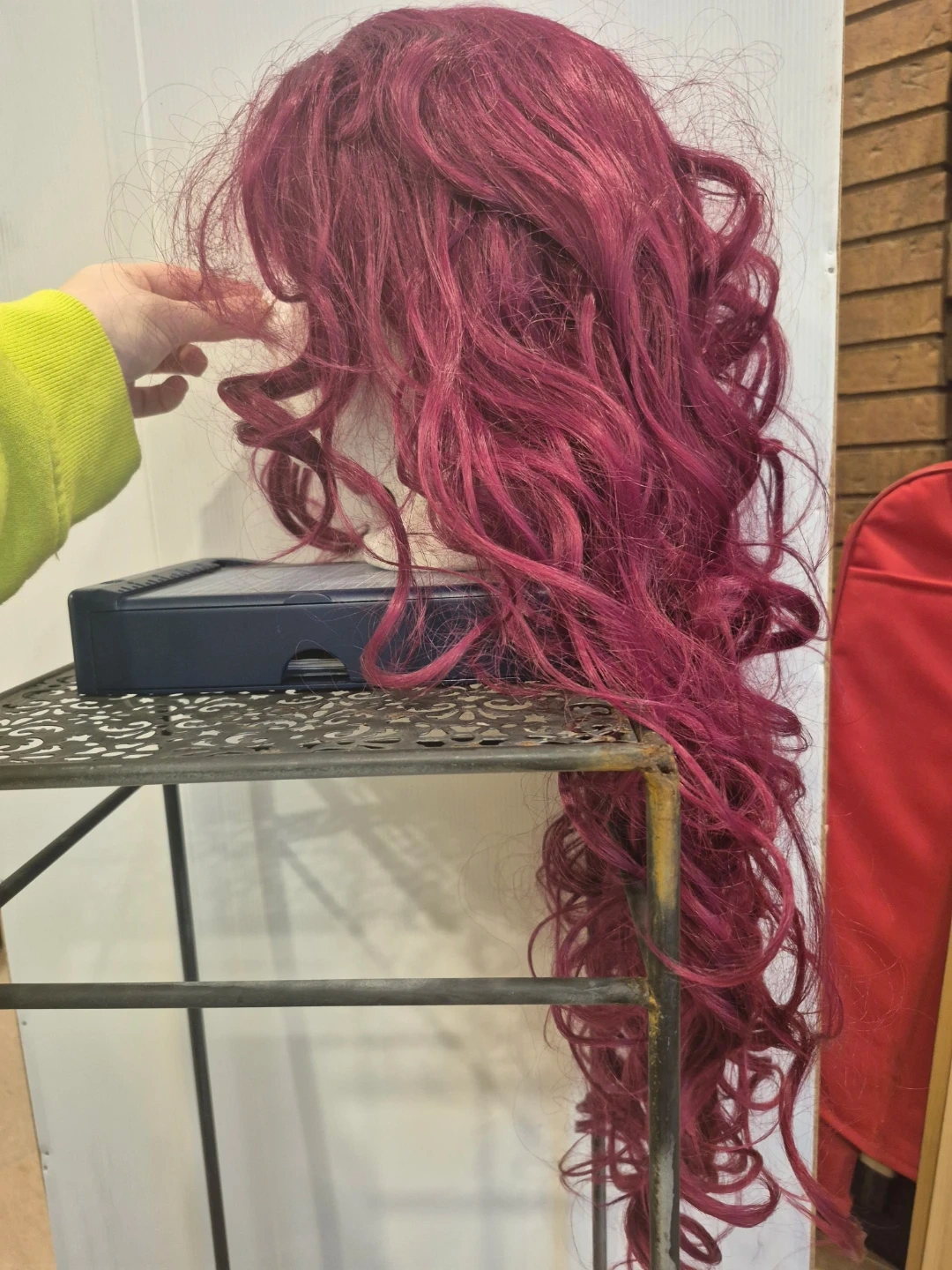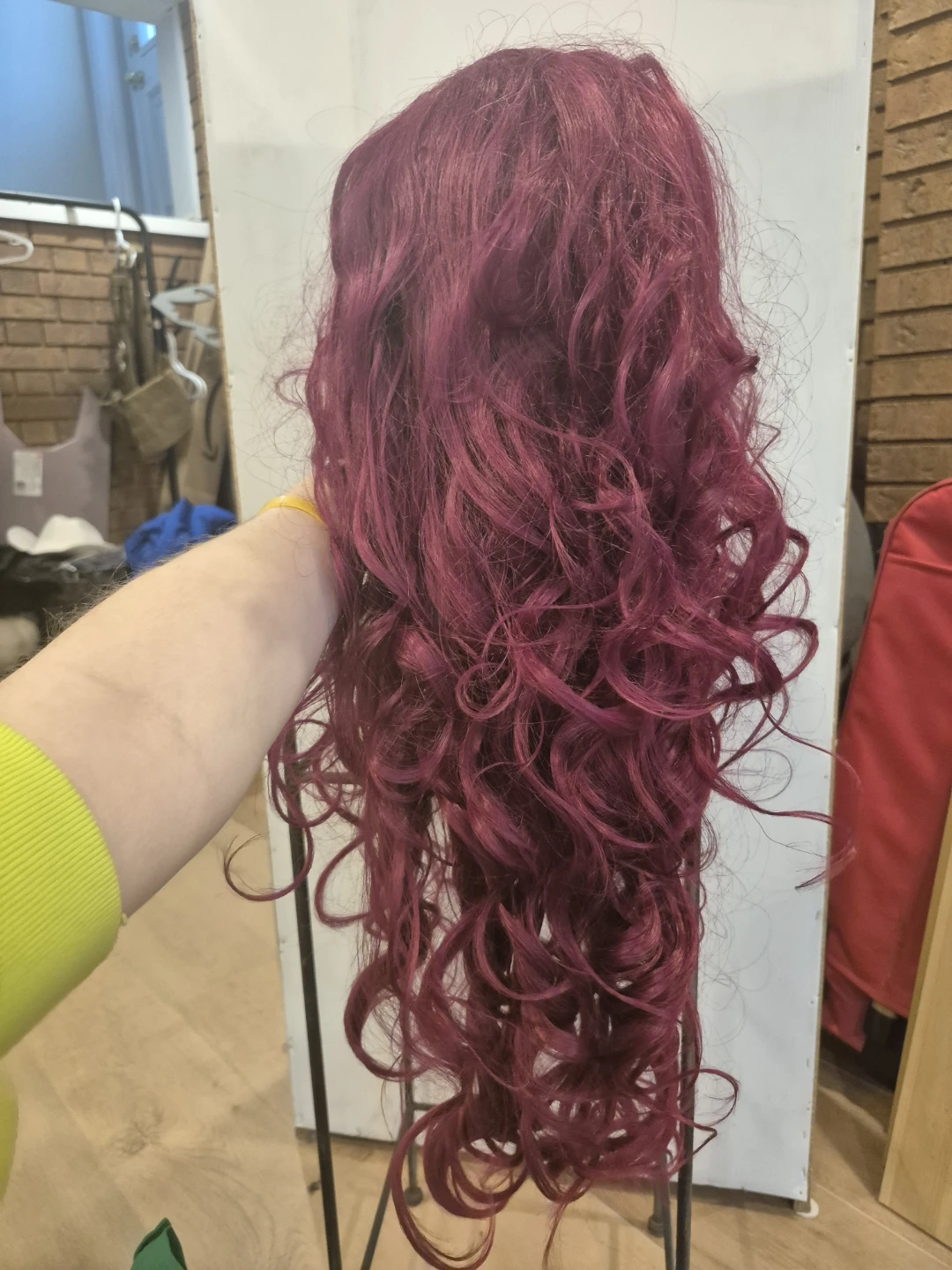 Here's a burgundy curly wig that's in good condition. It's a fun colour and style for a costume or just to change up your look!