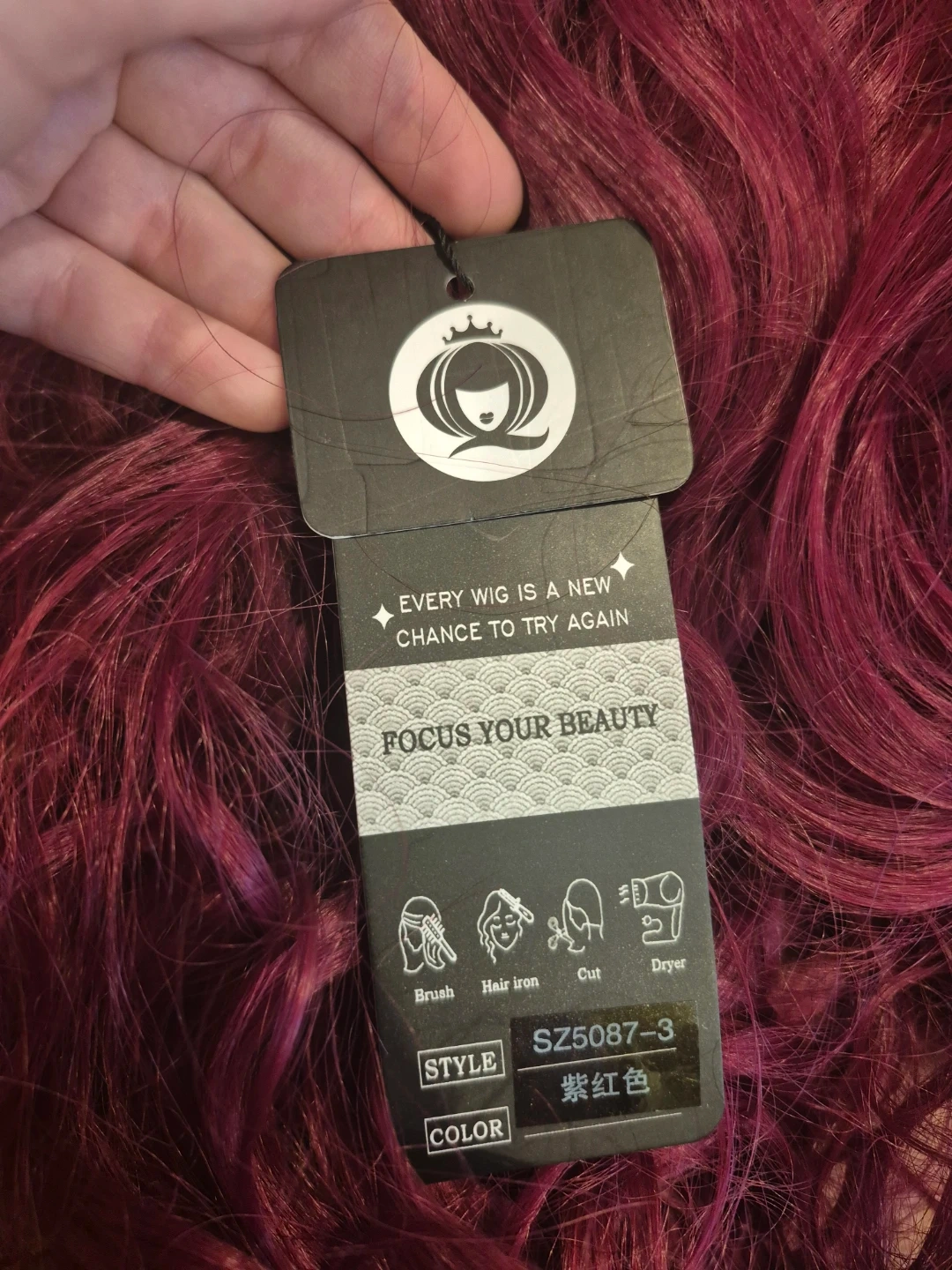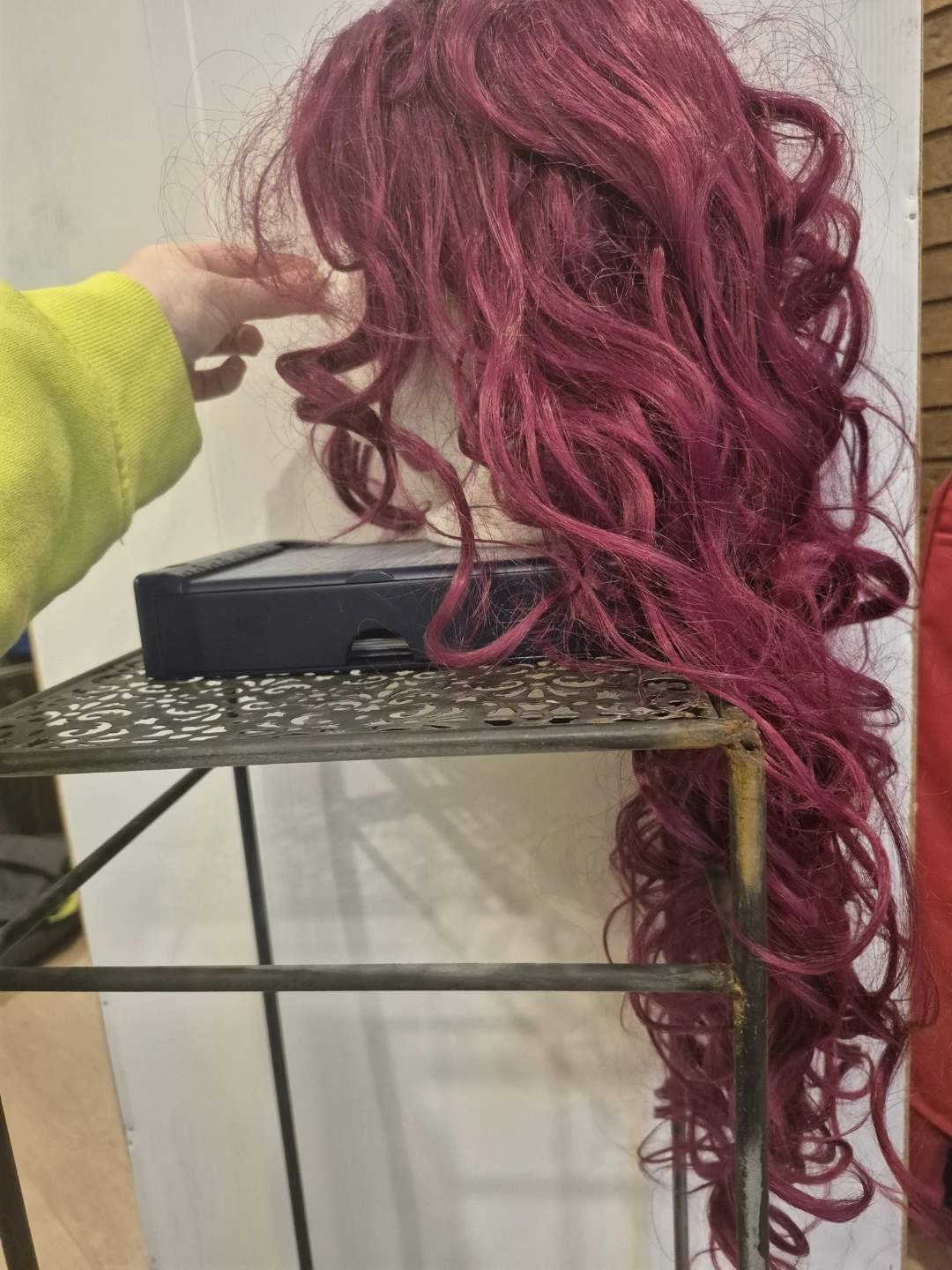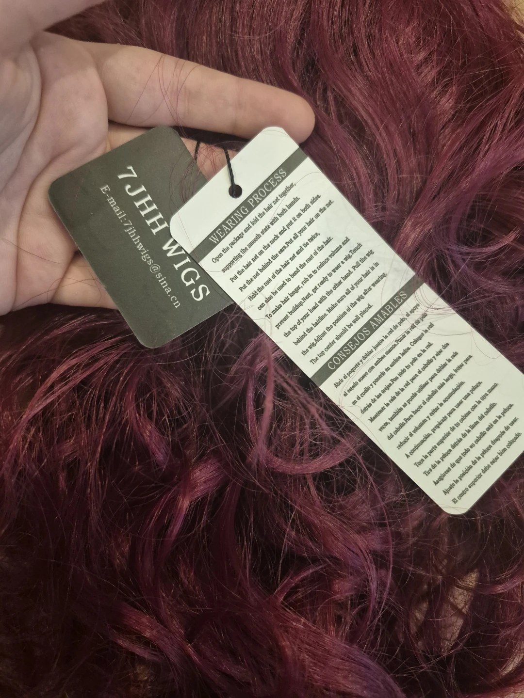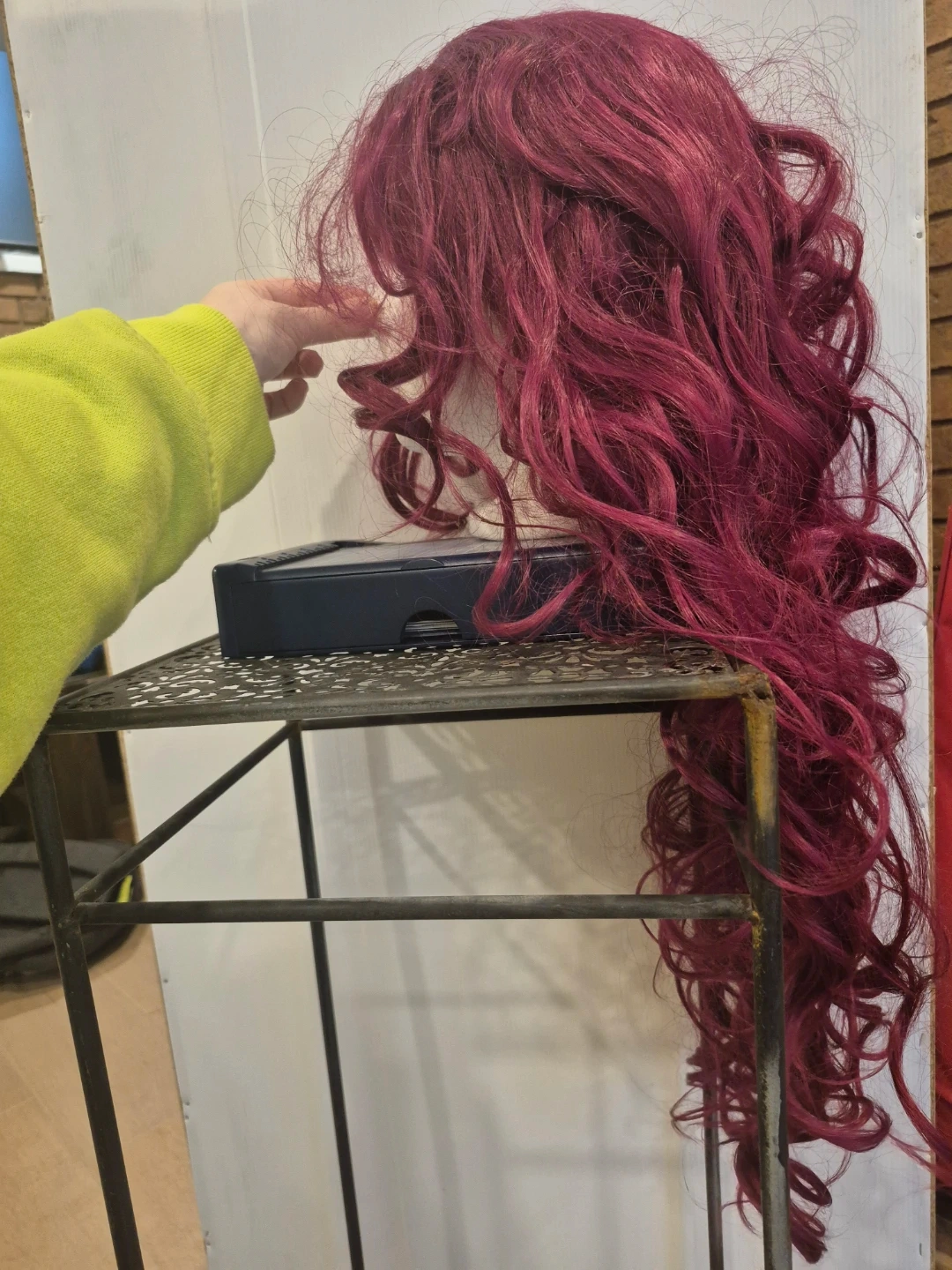 Here's a burgundy curly wig that's in good condition. It's a fun colour and style for a costume or just to change up your look!