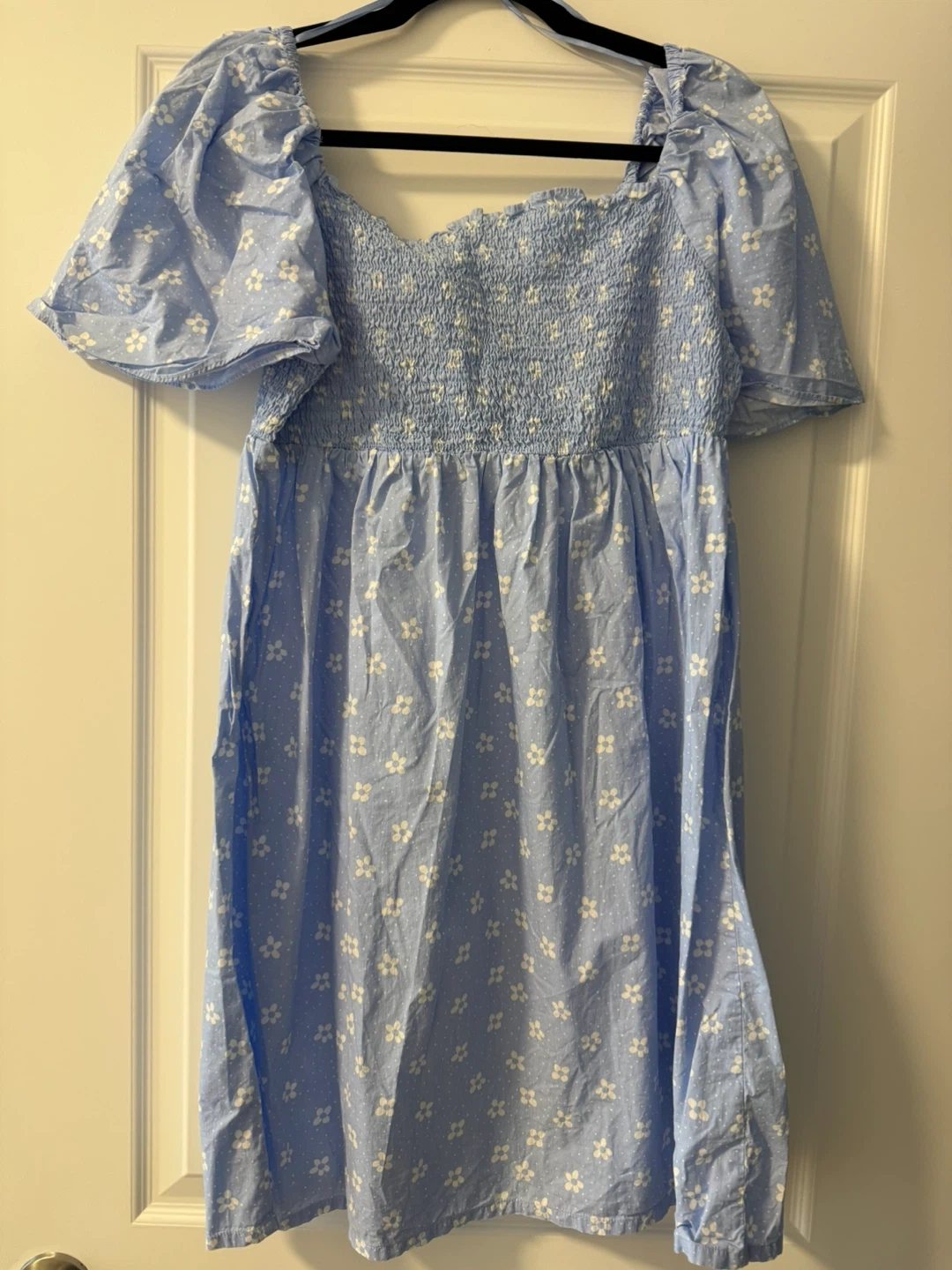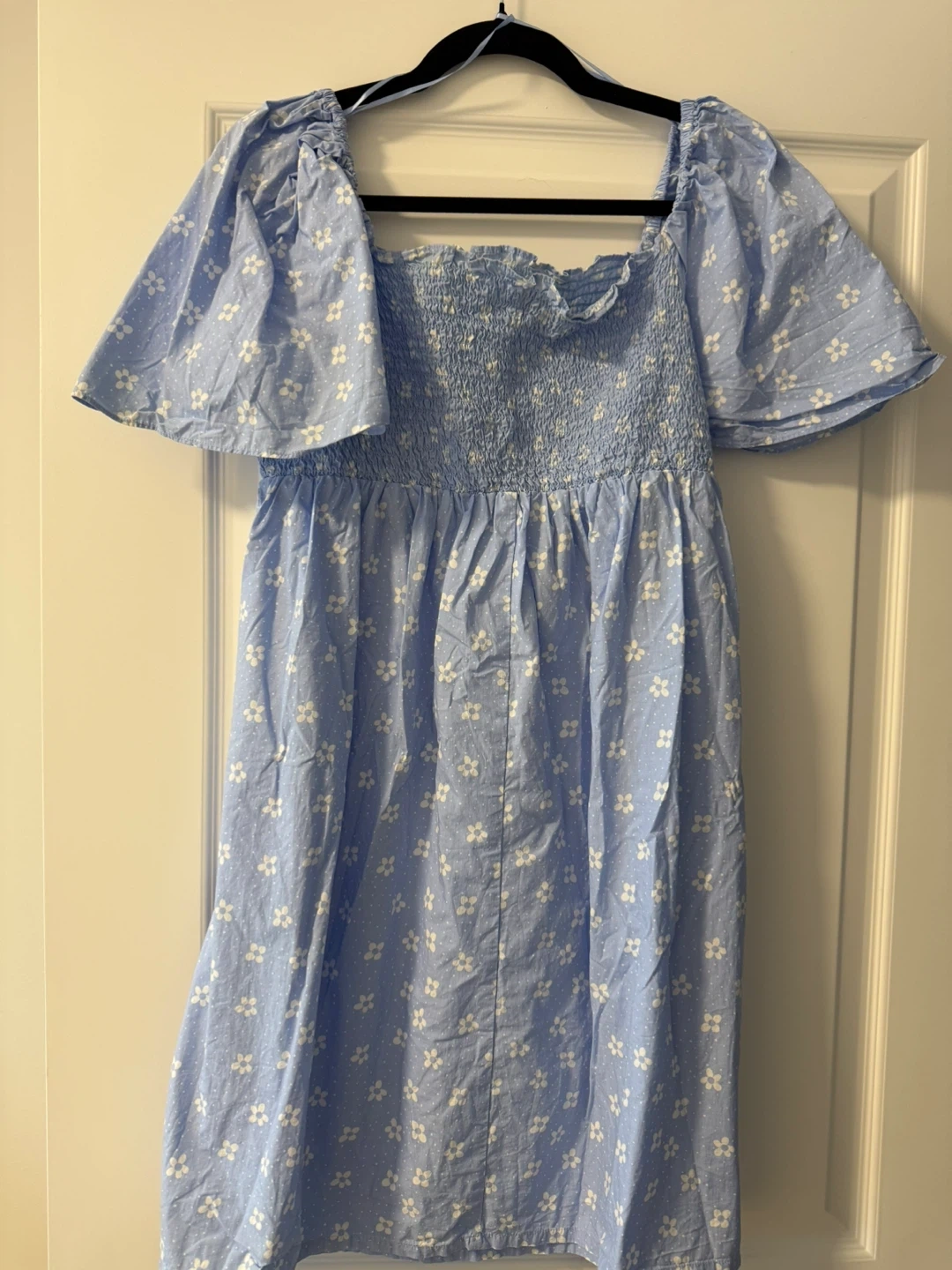 Here's a cute blue dress with a floral pattern! It features a smocked bodice and short sleeves. Perfect for a sunny day out