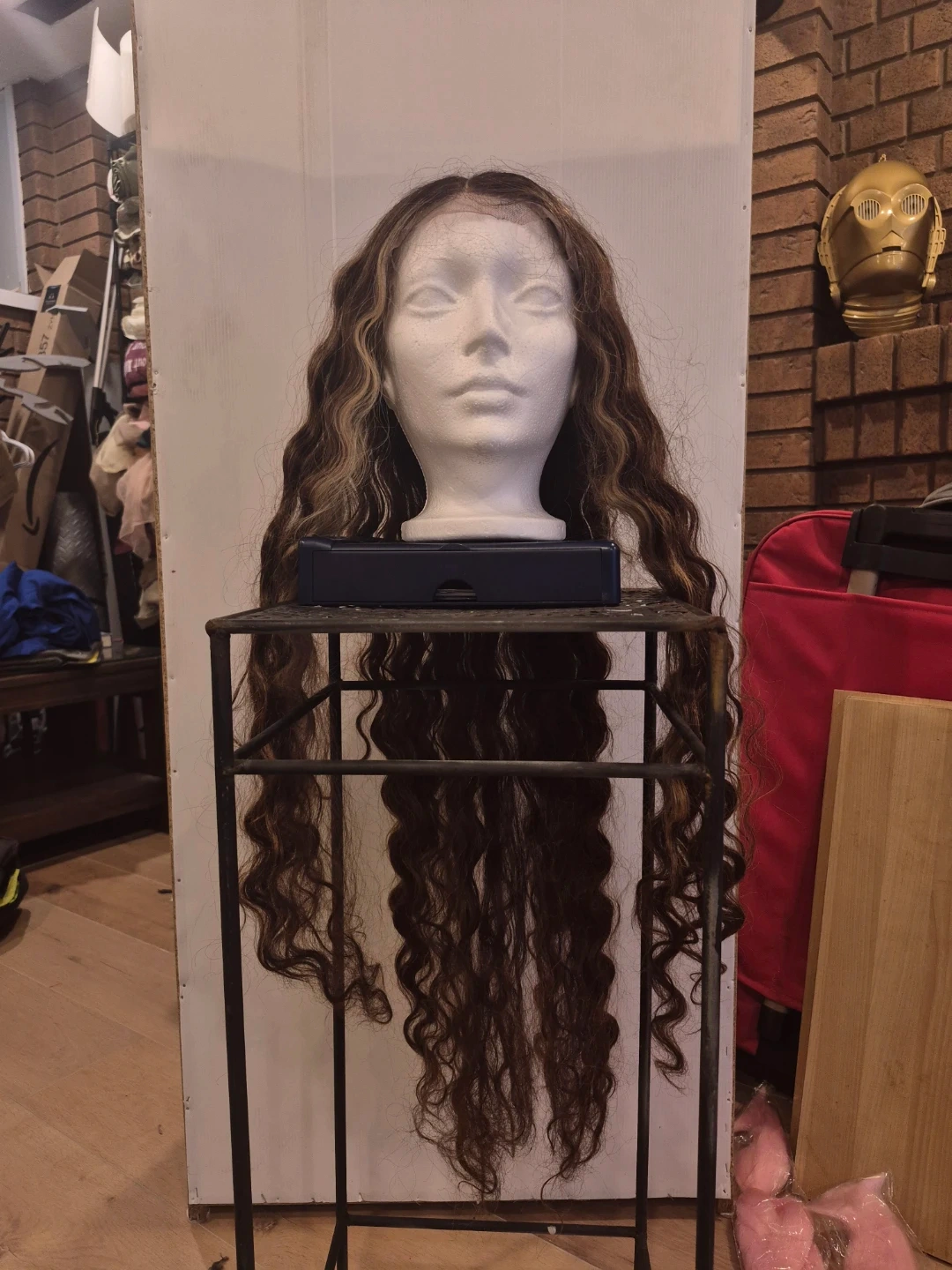 Selling a long, brown, curly wig. It appears to be in good condition and has a natural-looking curl pattern. Perfect for changing up your look or for costume use!