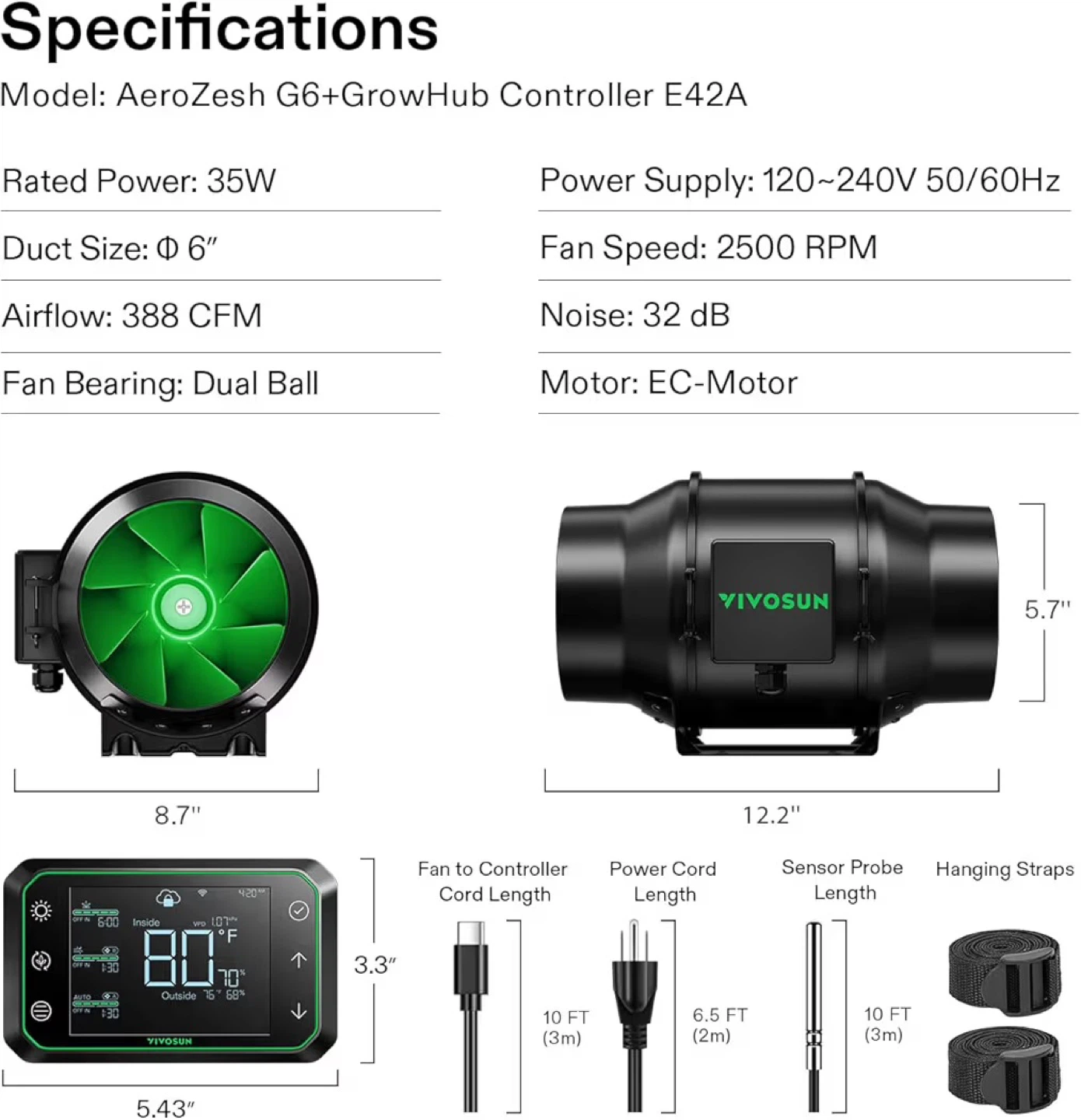 VIVOSUN AeroZesh G6 GrowHub Controller E42A 6" Duct Fan