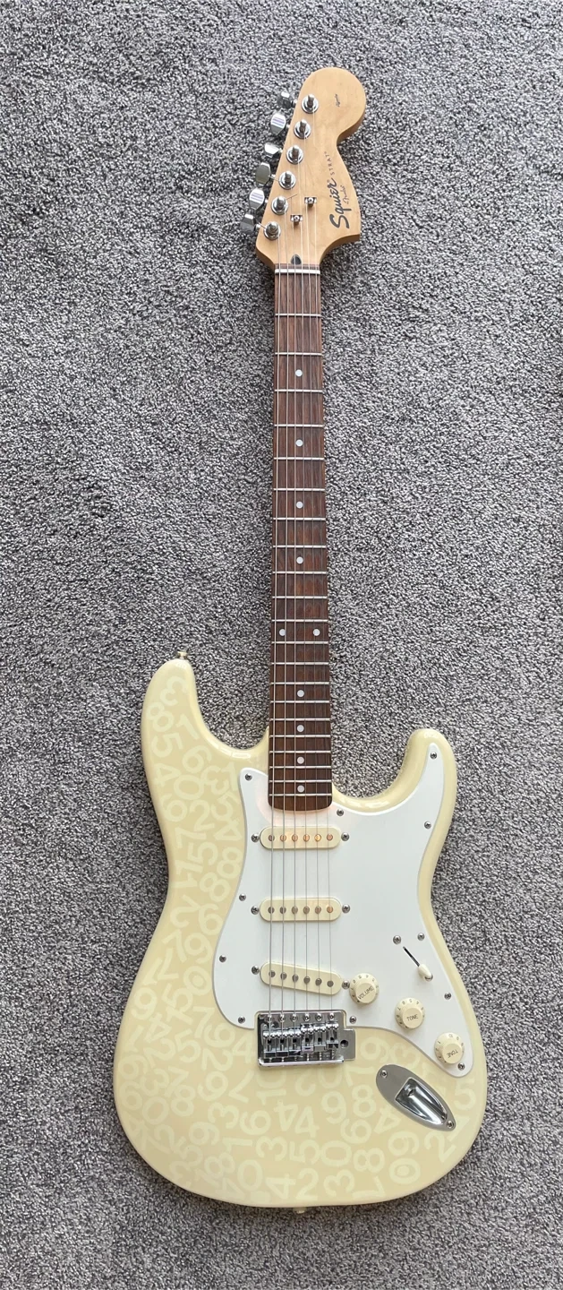 Up for sale is a unique and eye-catching 2004 Squier Affinity Series Stratocaster featuring "Numbers" graphic finish. This isn't your everyday white Strat—it is perfect for players who want a classic sound with a standout look.
