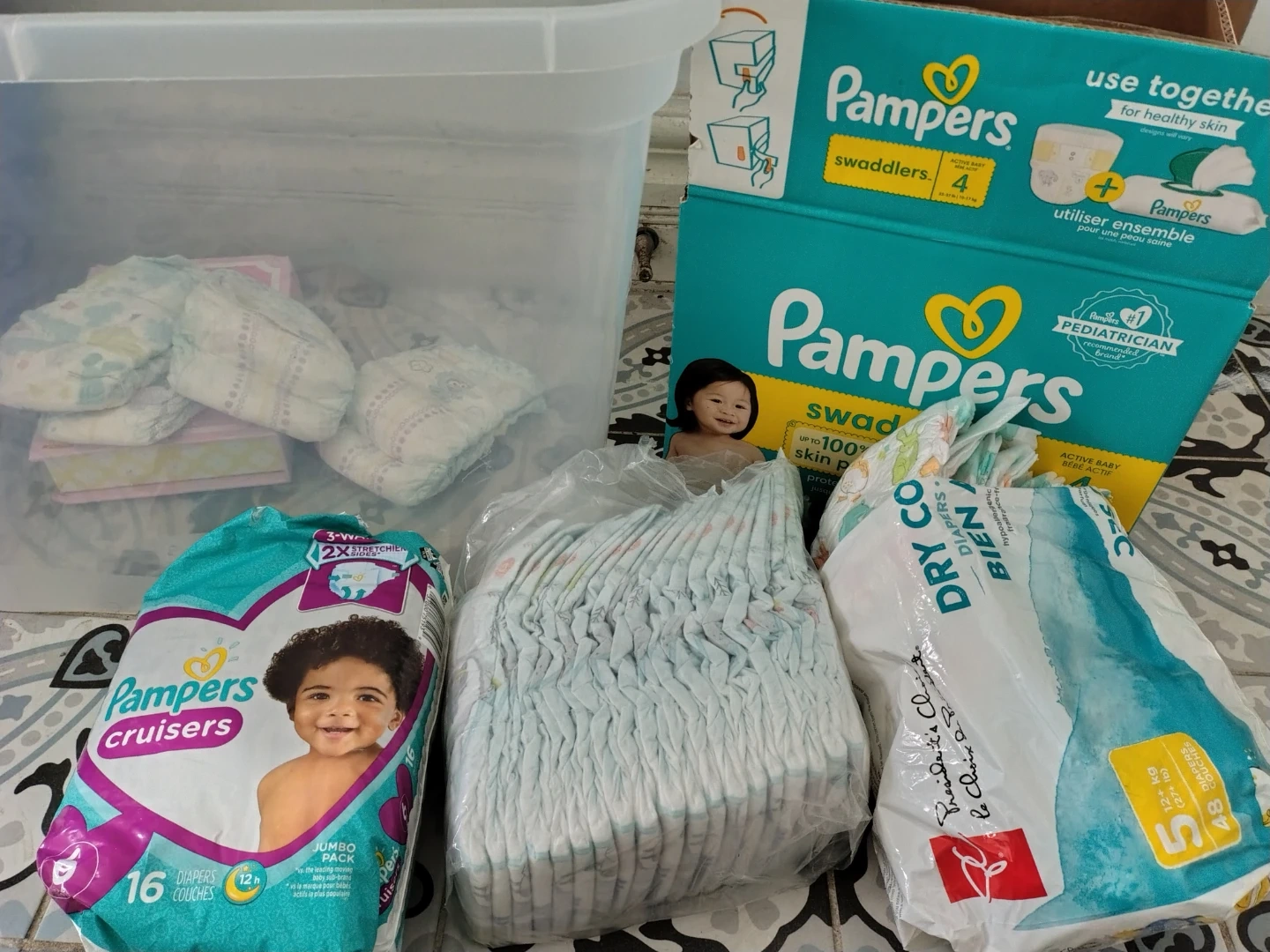 Size 5: one open sleeve (19 diapers left) + 17 diapers left in open President's Choice diapers