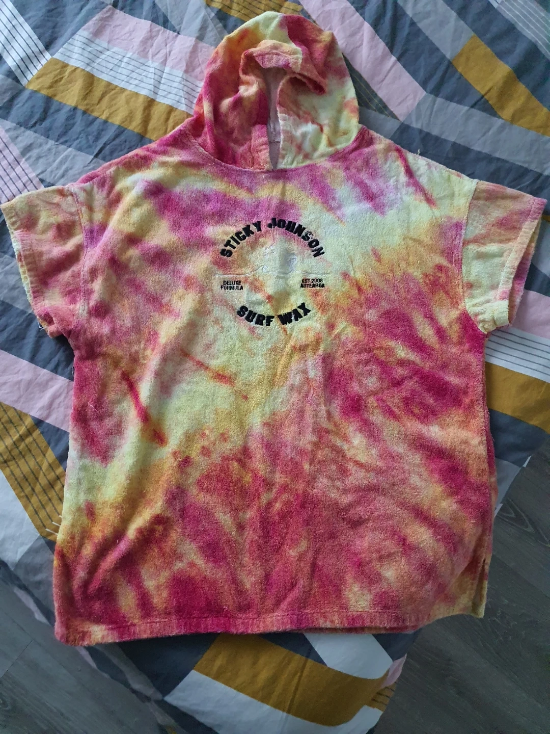 Check out this hooded towel poncho from Sticky Johnson Surf Wax! It's perfect for drying off after a surf session or a swim at the lake. The tie-dye design is super fun and vibrant