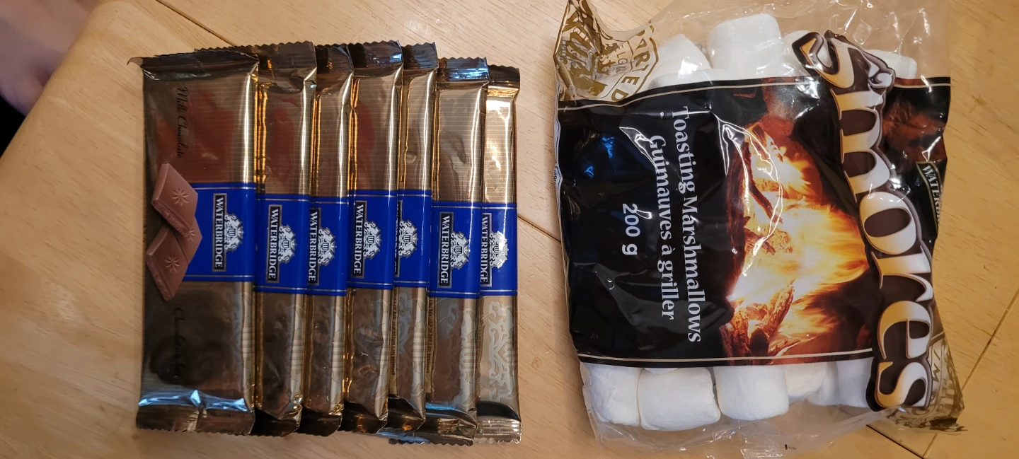 Waterbridge milk chocolate bars and toasting marshmallows! Perfect for making s'mores or enjoying separately! Too much sugar for our small family 😆