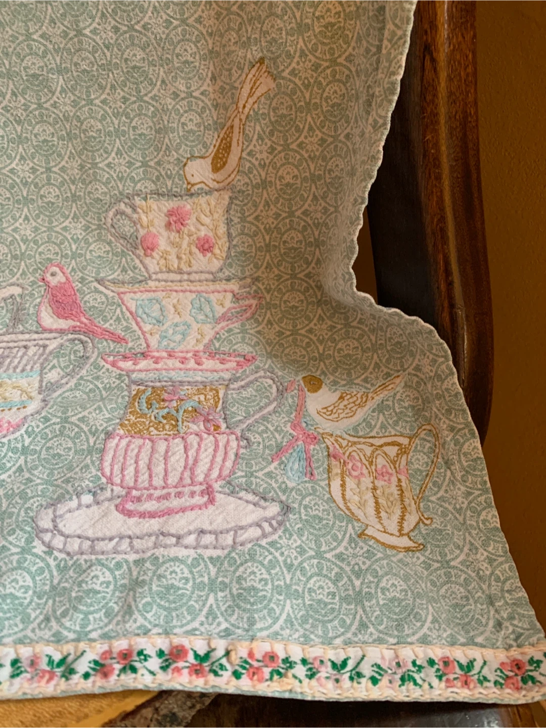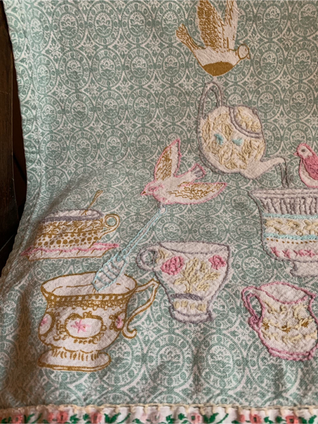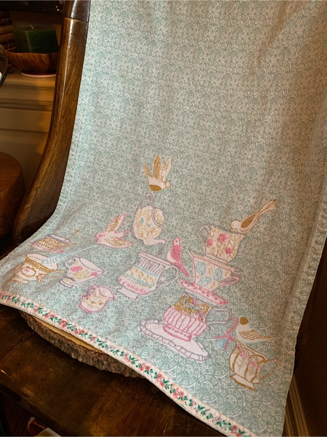 Here's a lovely kitchen towel featuring an embroidered design with teacups and birds! It has a pretty, soft green/teal background with colourful pastel embroidery details. It is made of 100% cotton from India. No tears or stains. Has a beautiful floral border at the bottom. Perfect for adding a touch of charm to your kitchen!