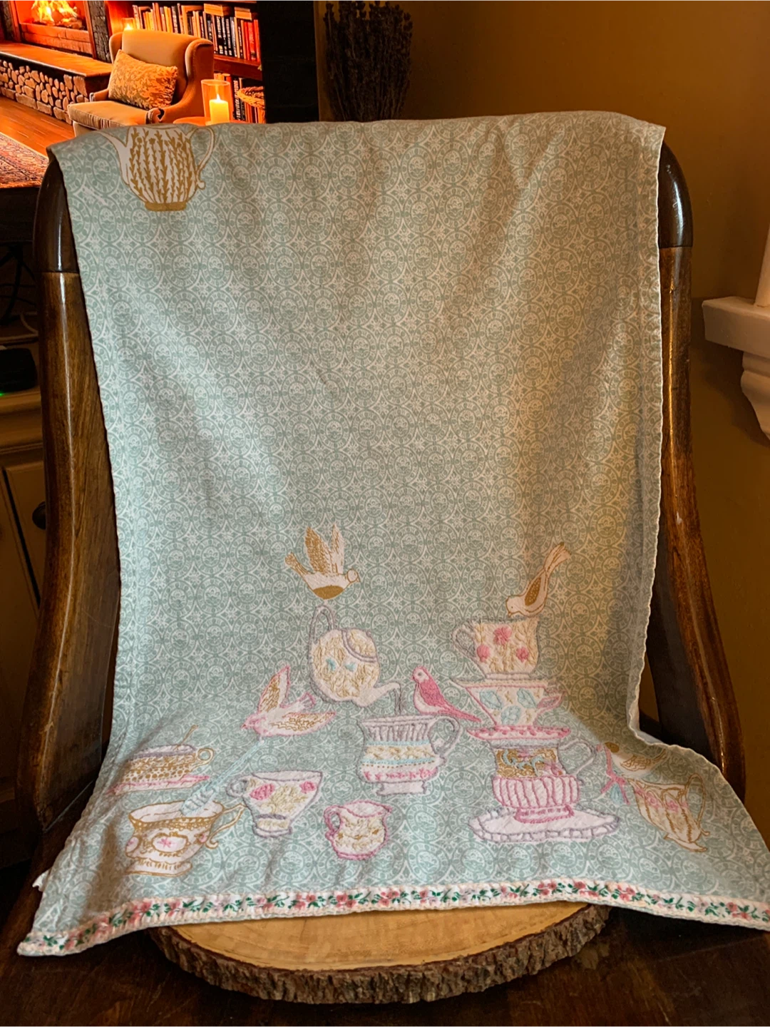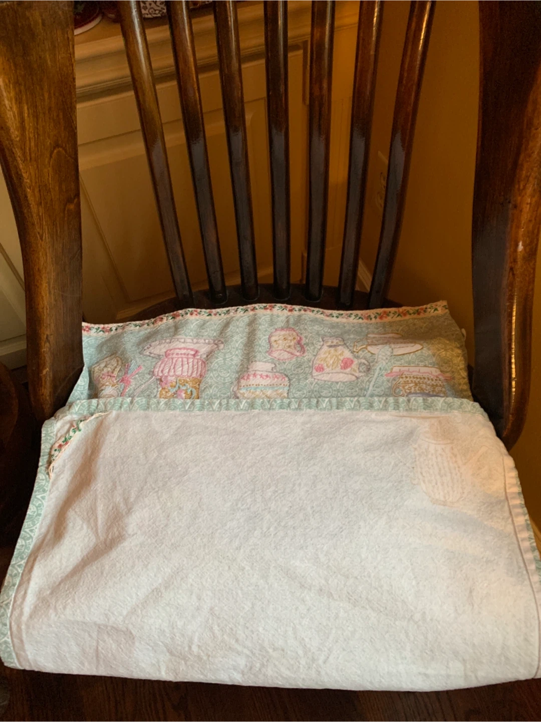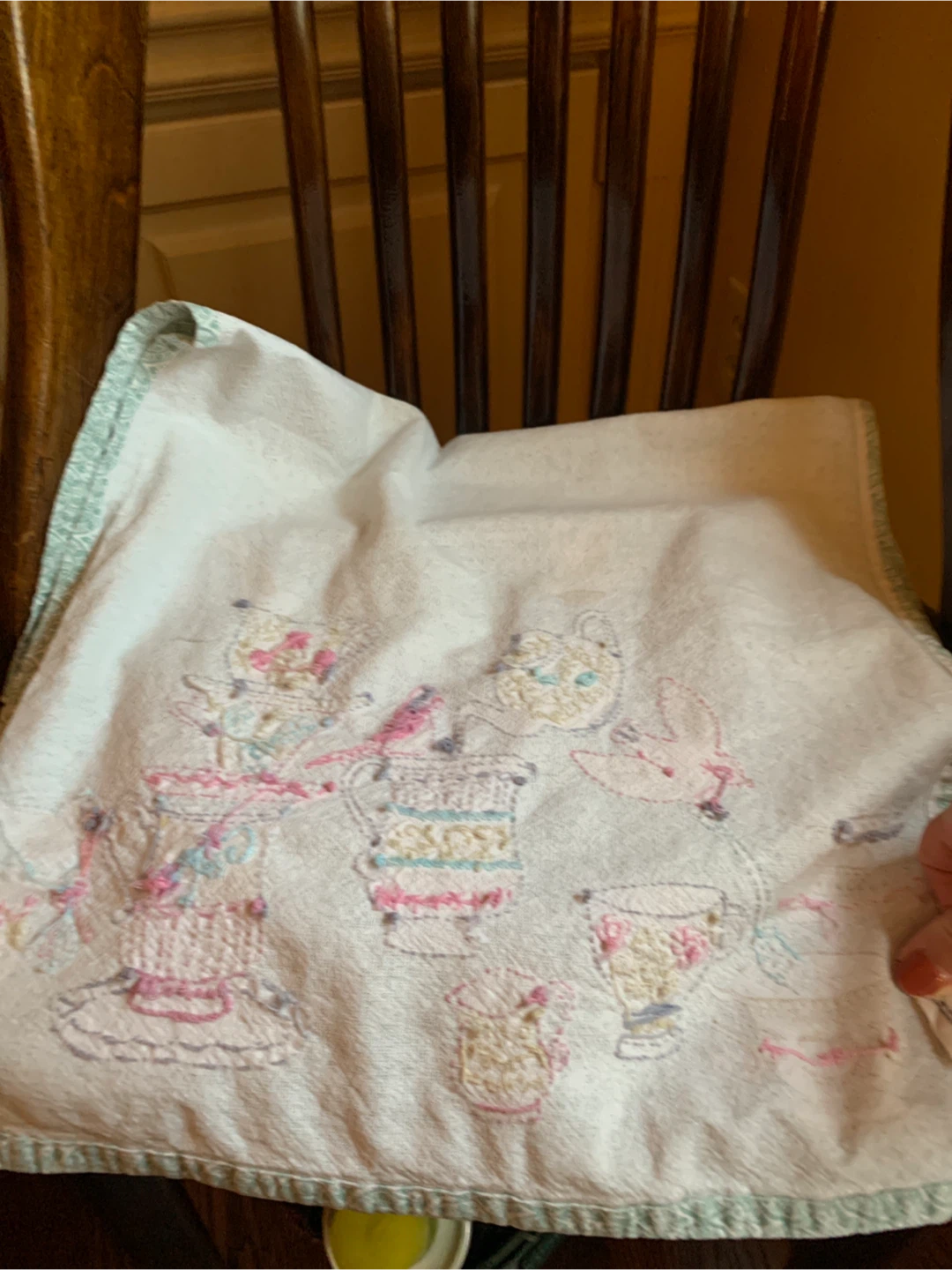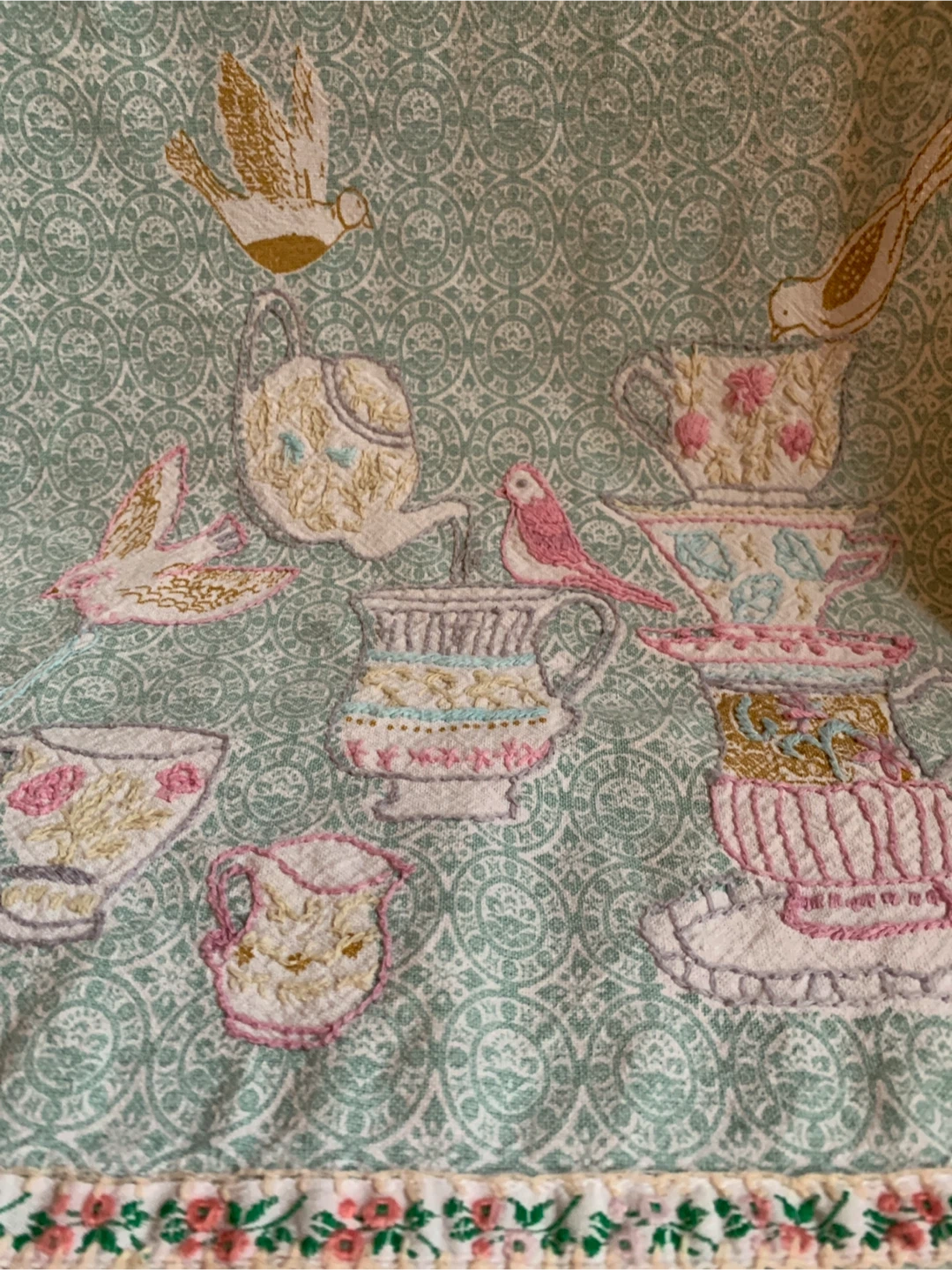 Here's a lovely kitchen towel featuring an embroidered design with teacups and birds! It has a pretty, soft green/teal background with colourful pastel embroidery details. It is made of 100% cotton from India. No tears or stains. Has a beautiful floral border at the bottom. Perfect for adding a touch of charm to your kitchen!