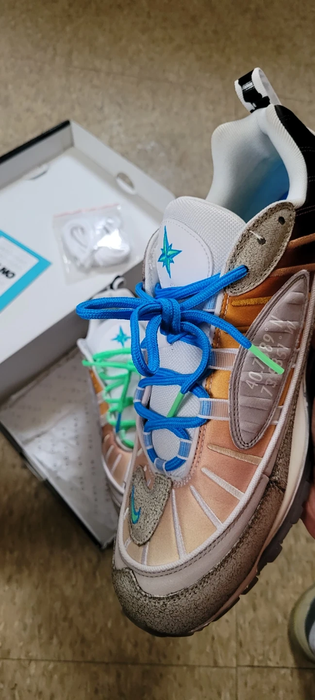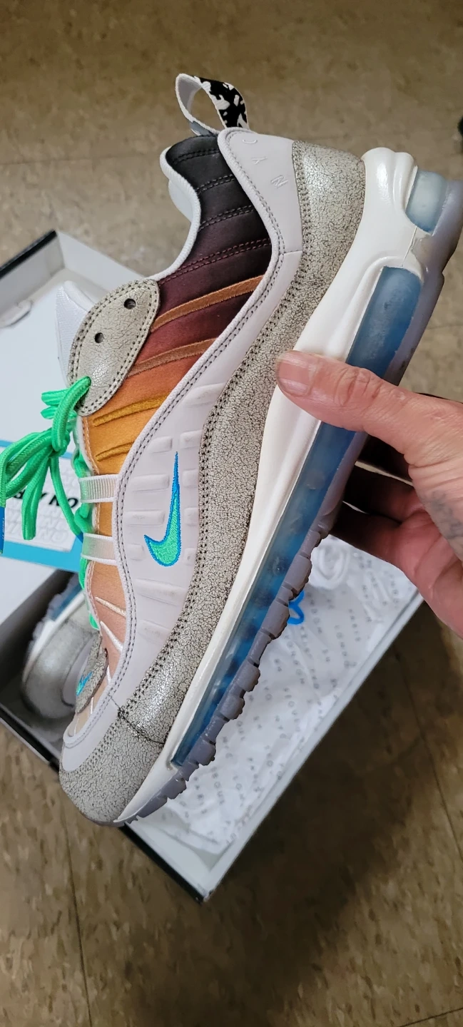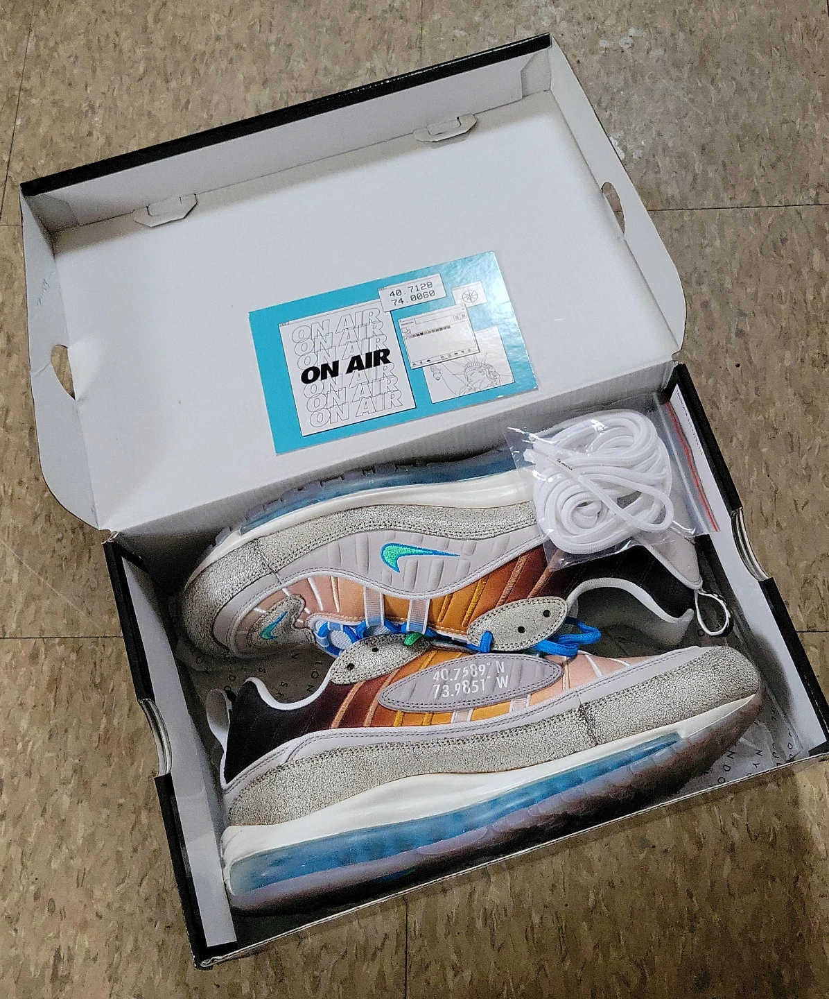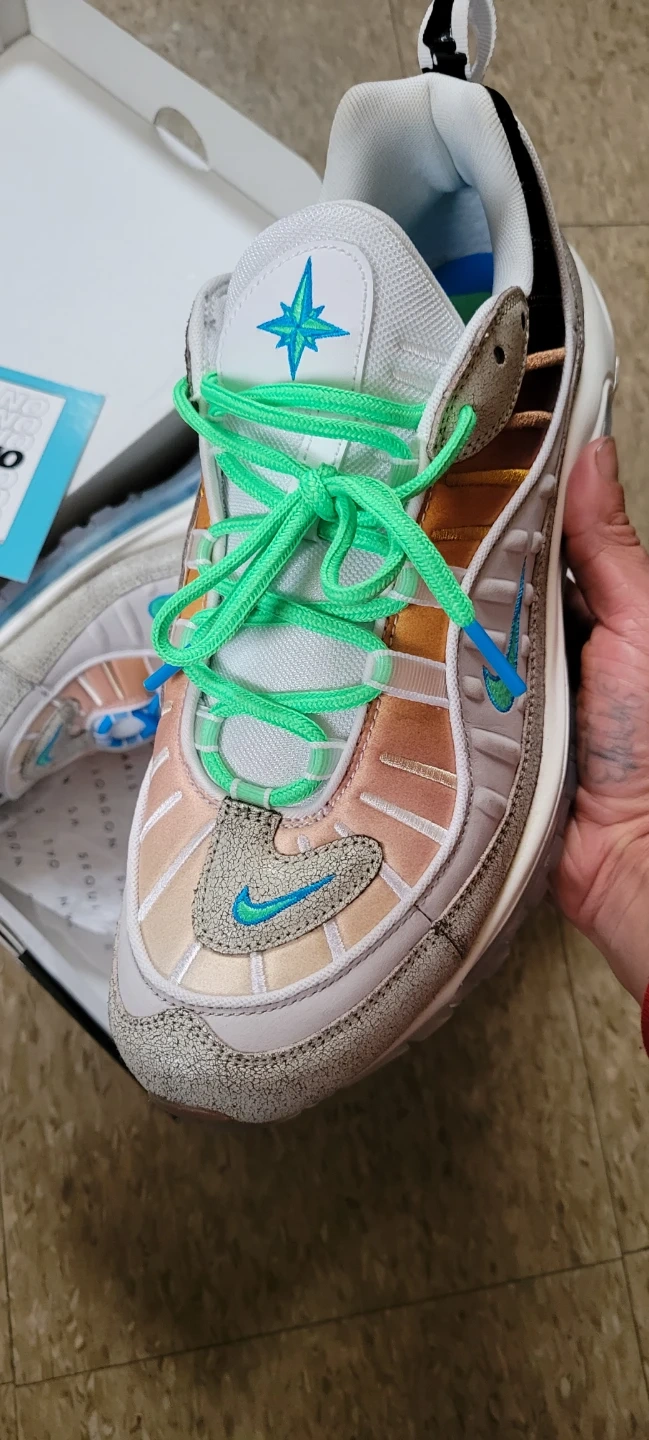 Selling a pair of Nike Air Max 98 On Air London sneakers. They come with the box and an extra pair of laces! The design features unique details and colors inspired by London.