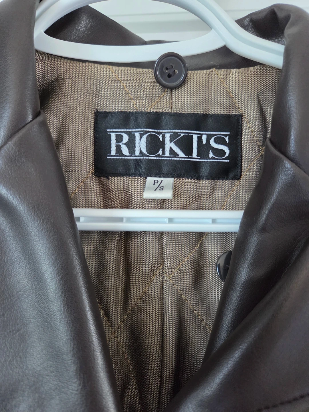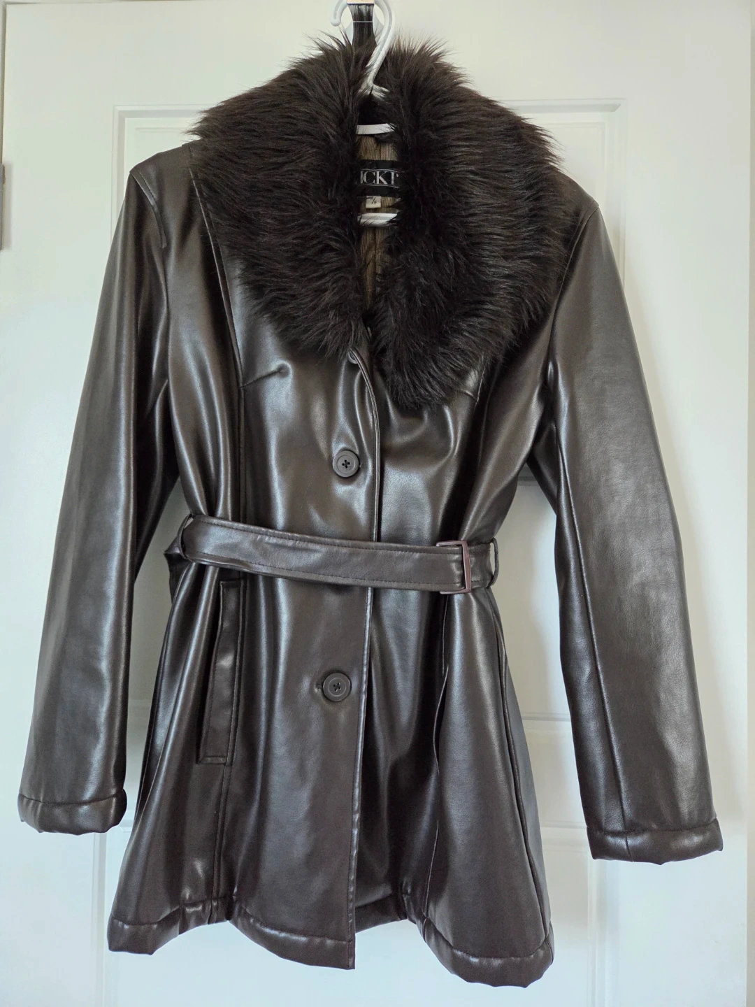 Selling a stylish brown faux leather coat from Ricki's. It features a faux fur collar and a belted waist. The fur is removable. Perfect for adding a style touch to your wardrobe!
