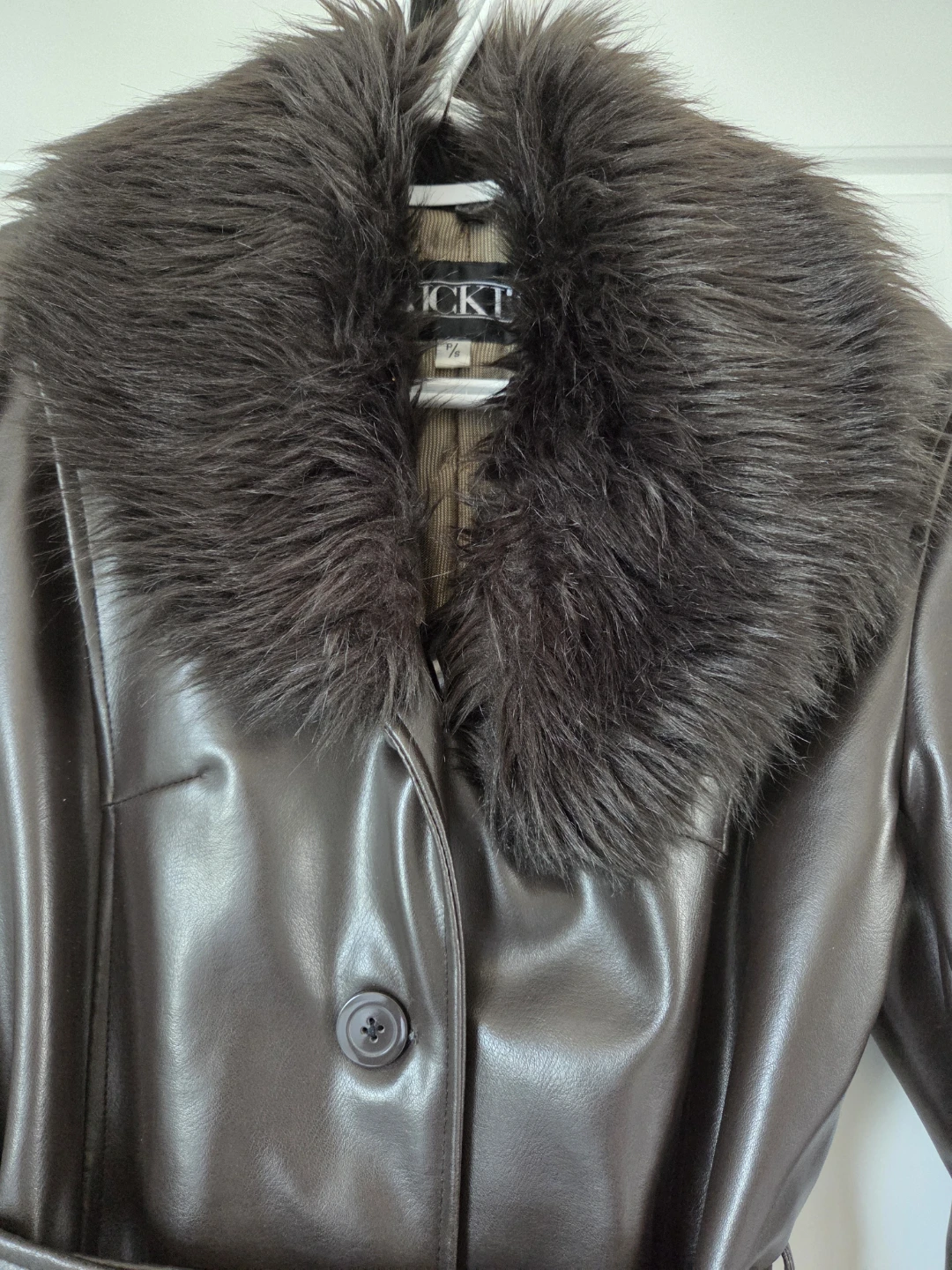 Selling a stylish brown faux leather coat from Ricki's. It features a faux fur collar and a belted waist. The fur is removable. Perfect for adding a style touch to your wardrobe!
