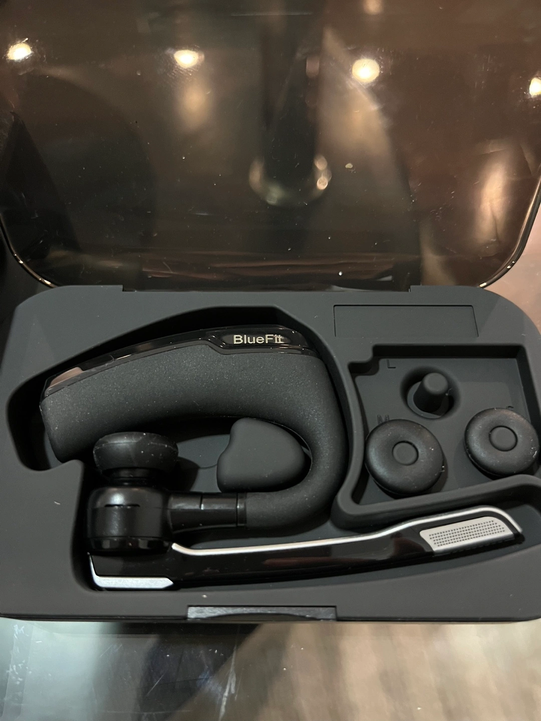 Selling a BlueFit wireless headset in black. It's a hands-free communication device with HD voice. Comes with the box and included components.