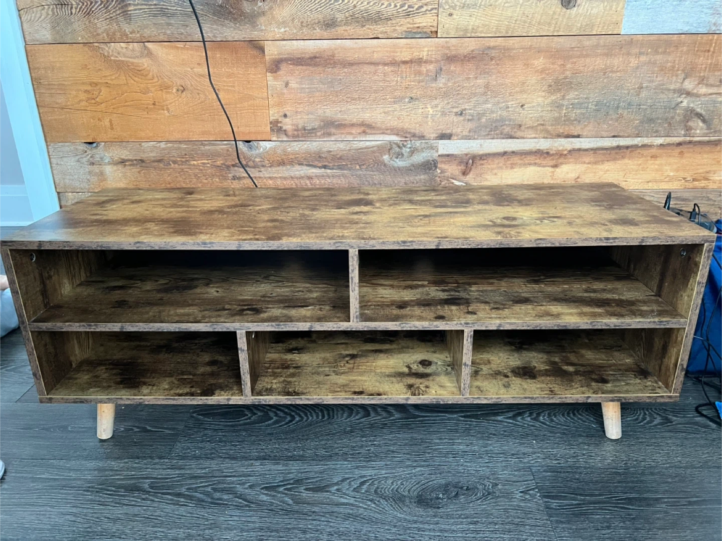 Selling a wood TV stand with storage shelves. It's in good condition and perfect for organizing your entertainment area!