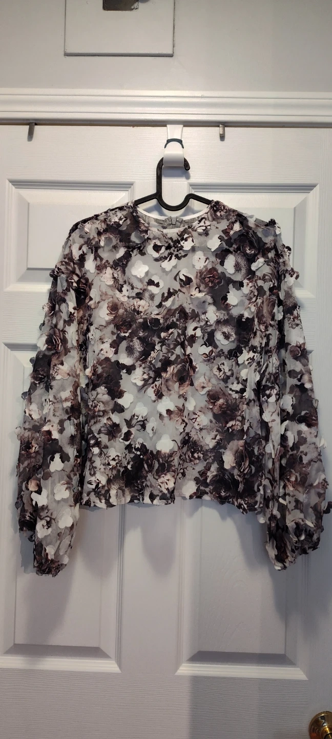 Here's a lovely floral print long-sleeve top! It's perfect for adding a touch of elegance to any outfit. The unique floral design and flowy sleeves make it a standout piece.