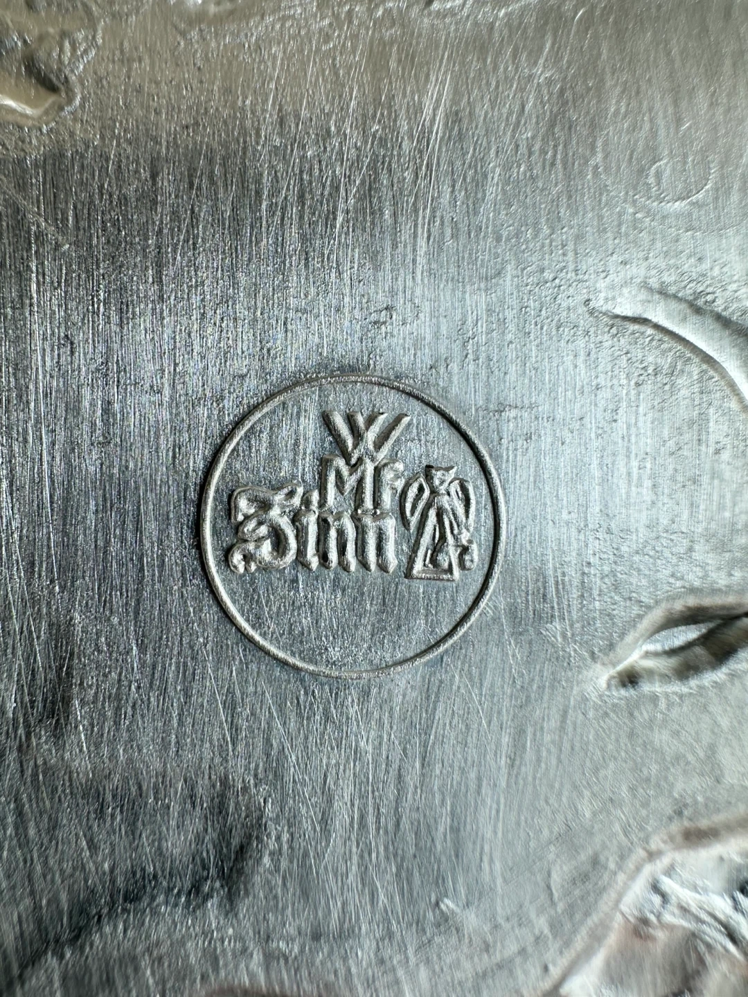 Selling a vintage WMF Zinn pewter plate. It features a detailed hunting scene with ducks and rifles. The plate has a classic design and would make a nice decorative item!