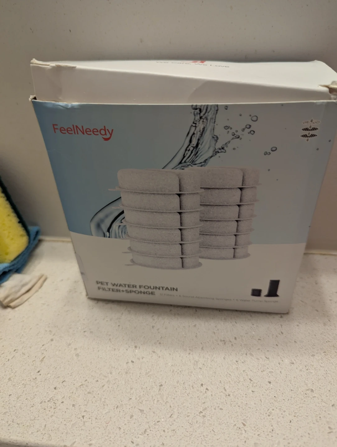 A box of FEELNEEDY 15 Pack Cat Water Fountain Filter & 5 Pack Pump Sponges & 5 Pack Sound-Absorbing Sponges, Pet Water Fountain Filter for 84 fl oz/2.5L Cat Water Fountain (F-016B)
