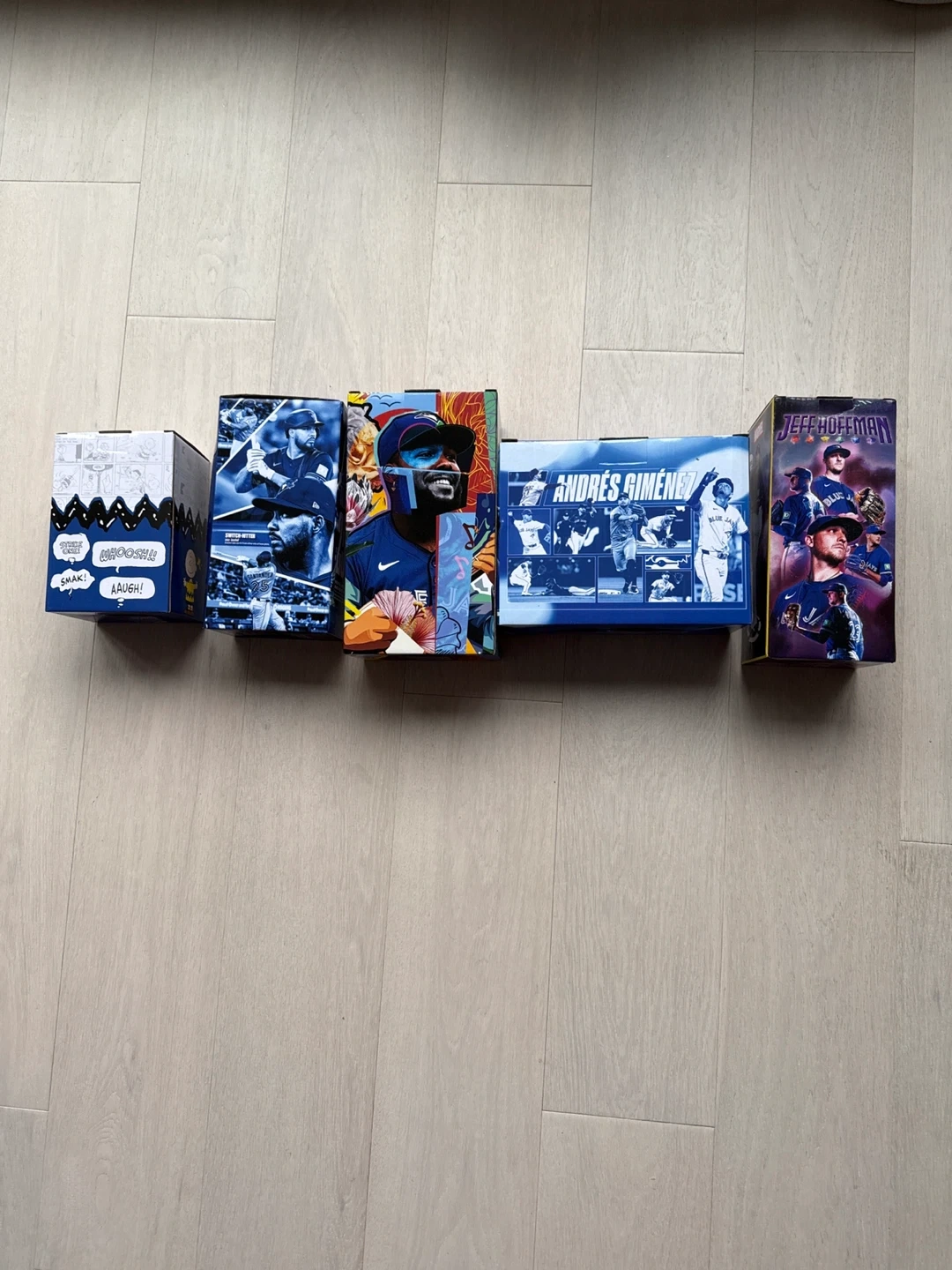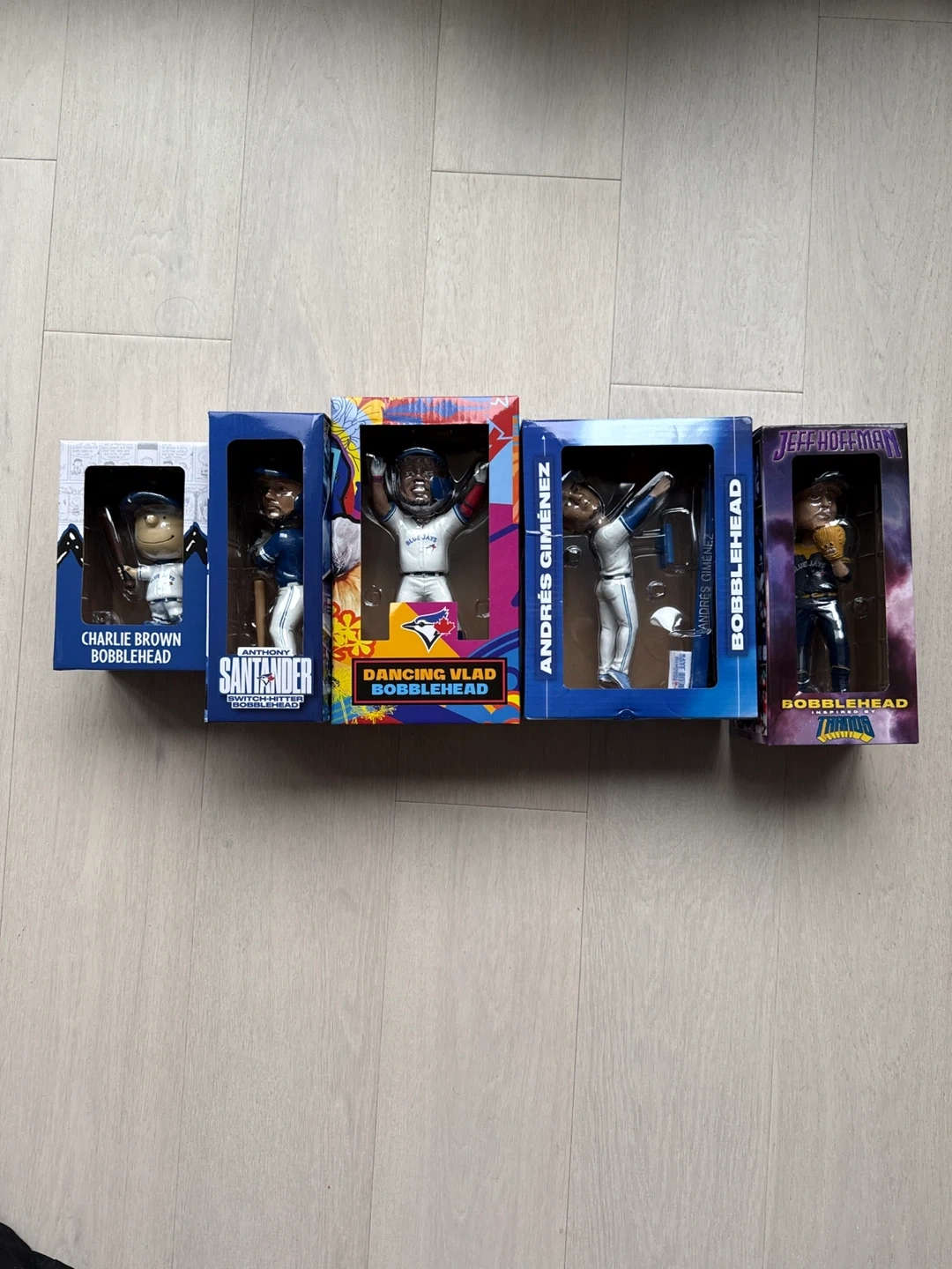 Toronto Blue Jays bobbleheads, all in their original boxes! Included are Charlie Brown, Anthony Santrider, Dancing Vlad, Andres Gimenez, and Jeff Hoffman. These would be perfect for any Blue Jays fan or bobblehead collector $20 each