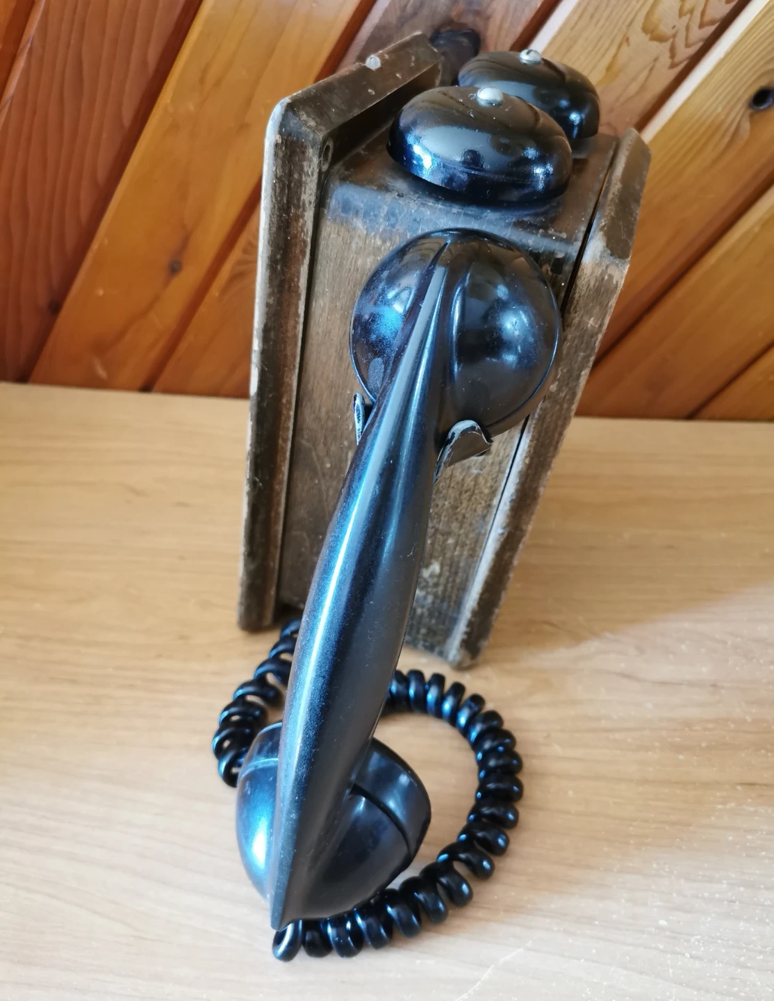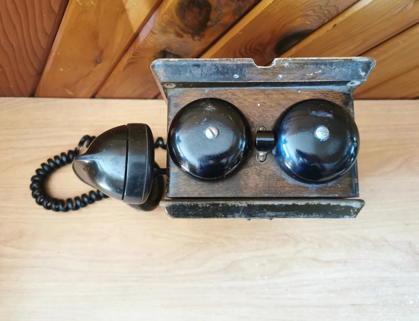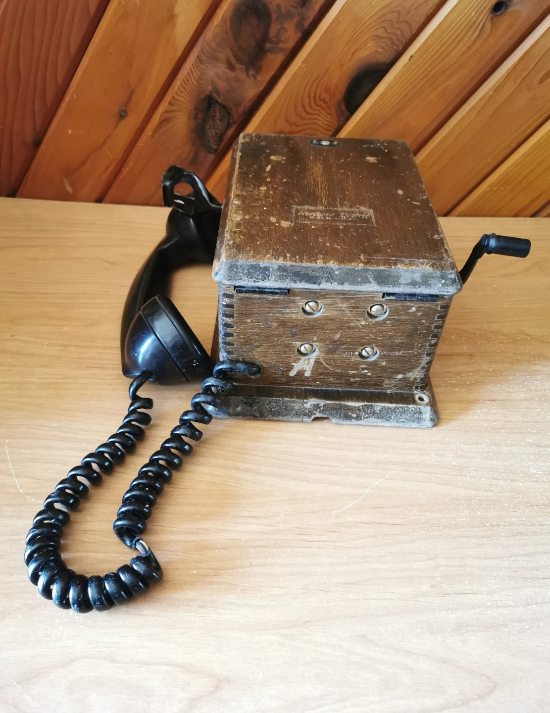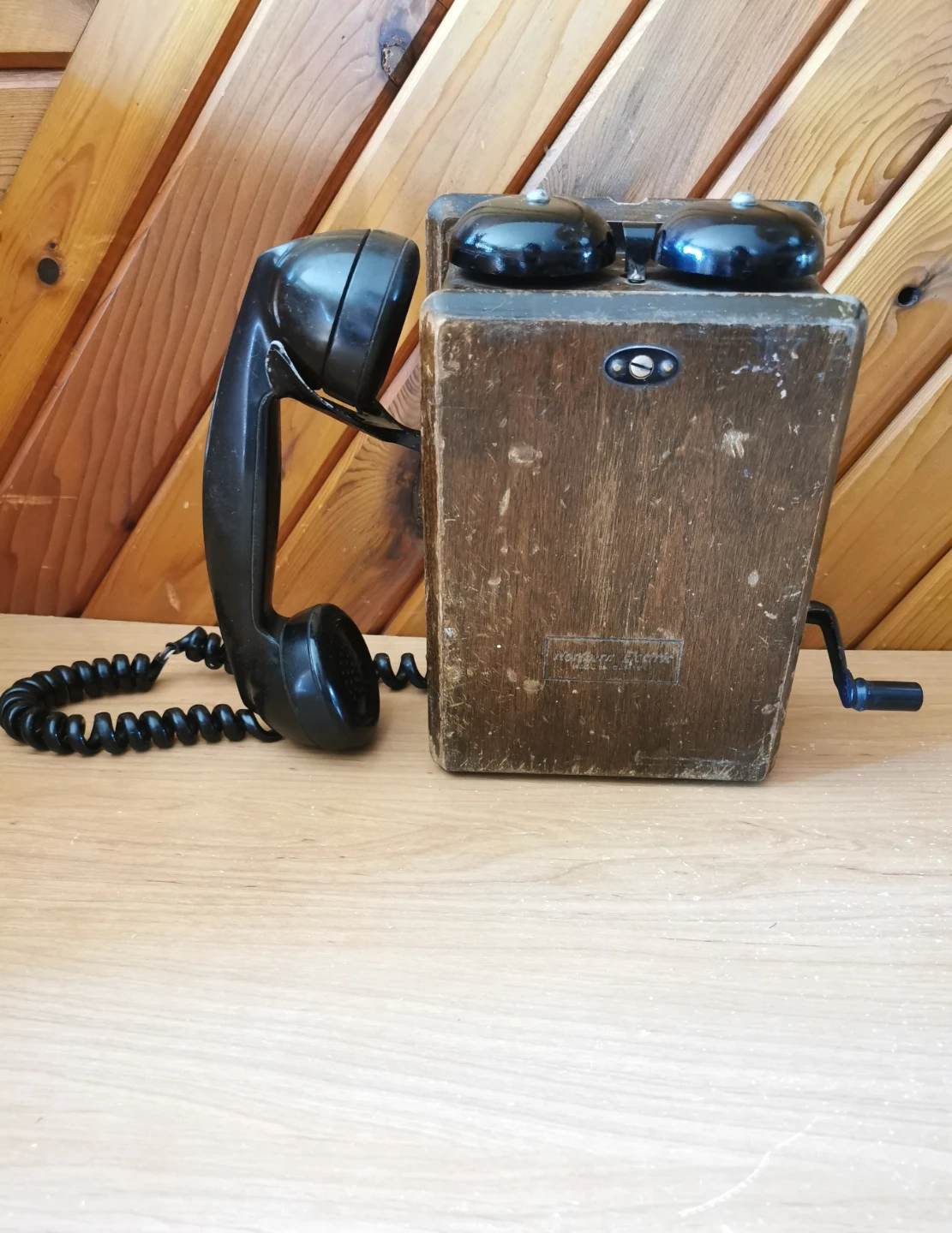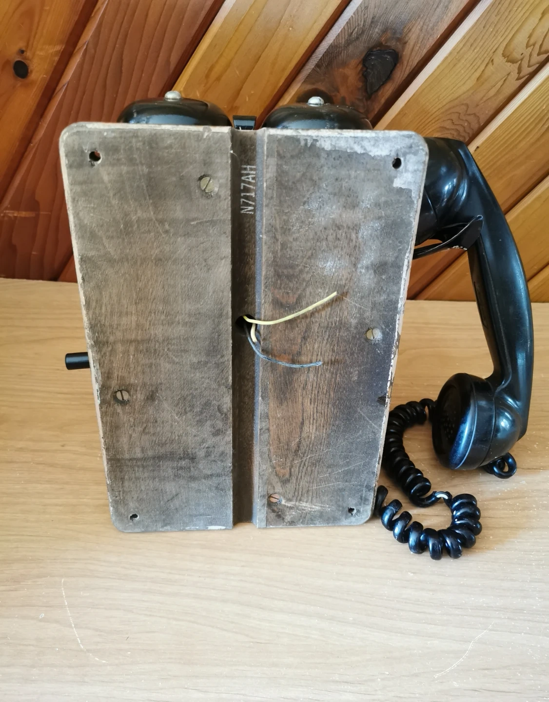 The model number N717AH is stamped into the wood. The cord appears to be a later upgrade in the 1950s to the original fabric covered cord, making it a unique transitional piece. Original wood casing with visible patina, scratches, and minor wear from age. Crank handle intact and moves freely. Bells on top intact but untested. Overall good antique condition, untested for functionality and sold as display/decor item. Perfect for collectors, antique decor enthusiasts, or restoration proiects. About 9 inch long, 6 inch wide. Pick up downtown Calgary, parking available, cash only please