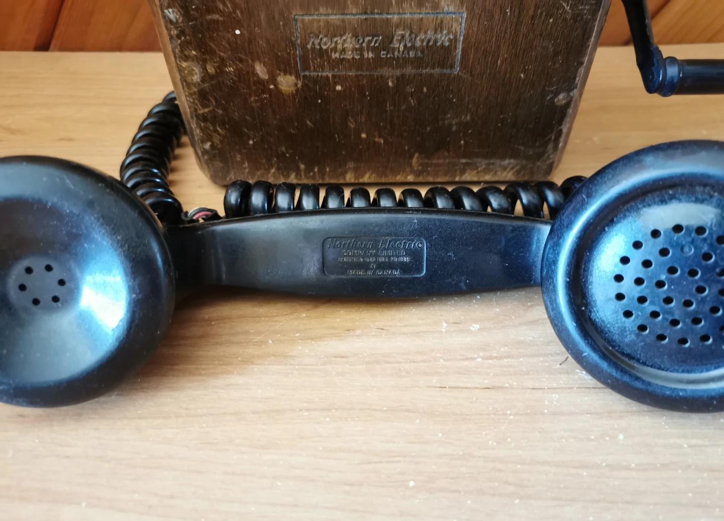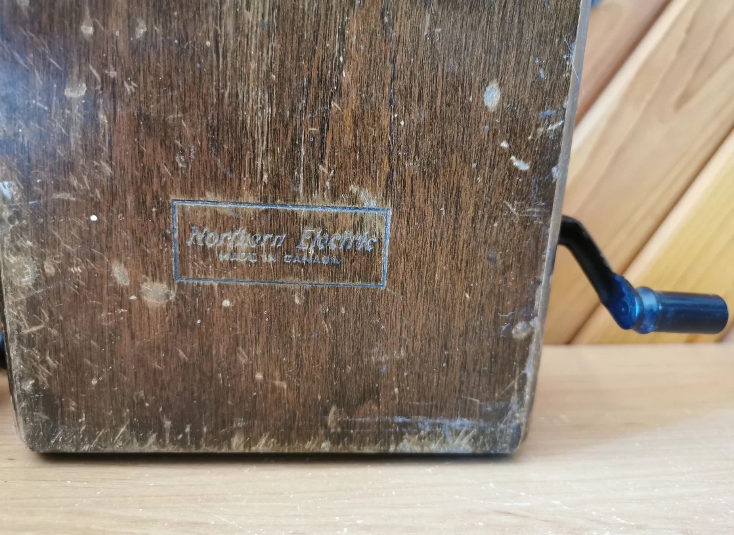 Northern Electric wooden wall box telephone, presented in 1922, 1923, and reissued in 1925. Made in Canada, serviced by BC Telephones. It features a crank magneto system, a black Bakelite handset with coiled cord, and dual bells mounted on top. Originally used in early telephone exchanges, this antique Art Deco piece showcases a key moment in telecommunications history.
