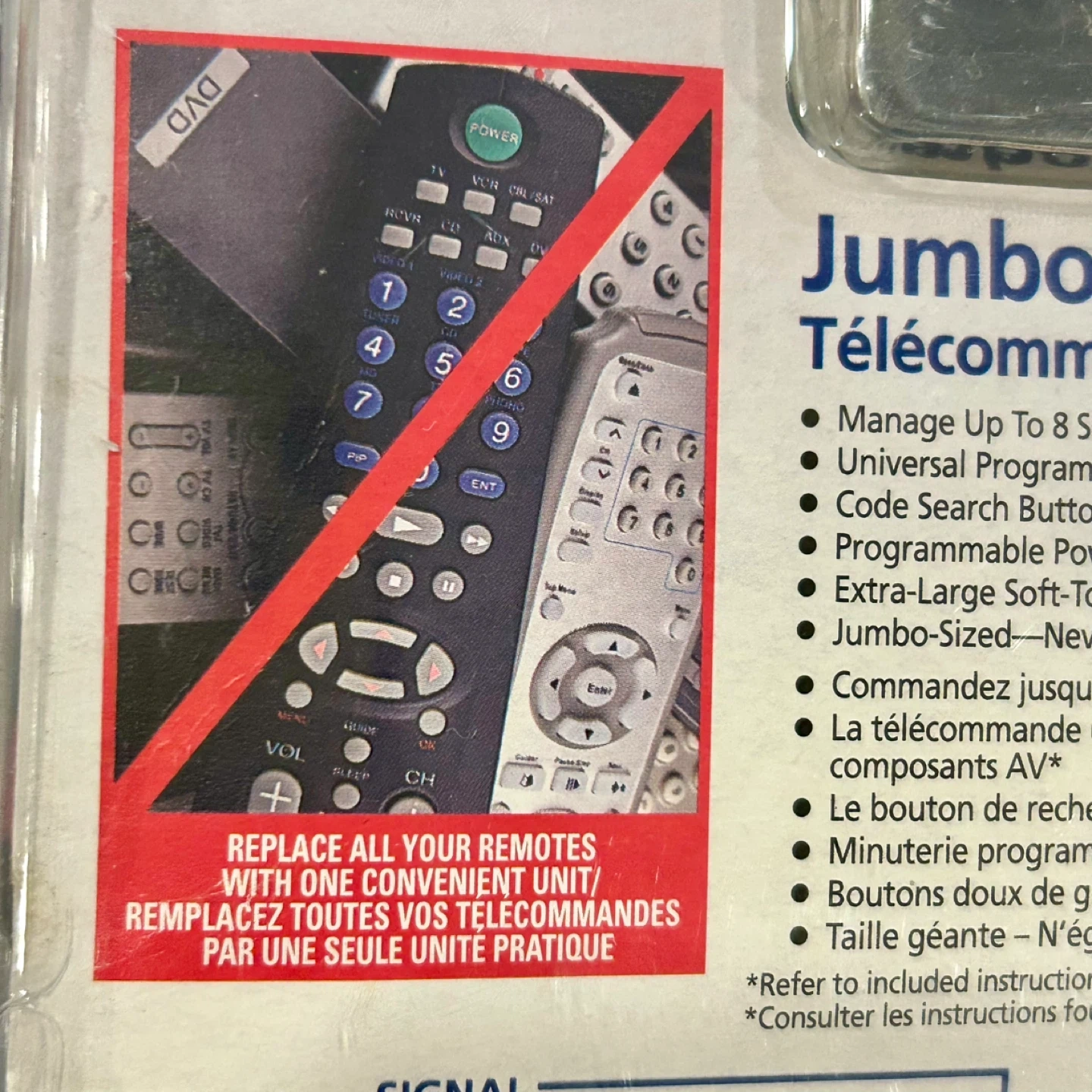 I have a brand new Emerson Jumbo Universal Remote for sale! It's still in its original packaging. This remote can manage up to 8 devices and has extra-large, soft-touch buttons. It's programmable and features a code search button, making it easy to set up. A great way to replace all your remotes with one convenient unit!
