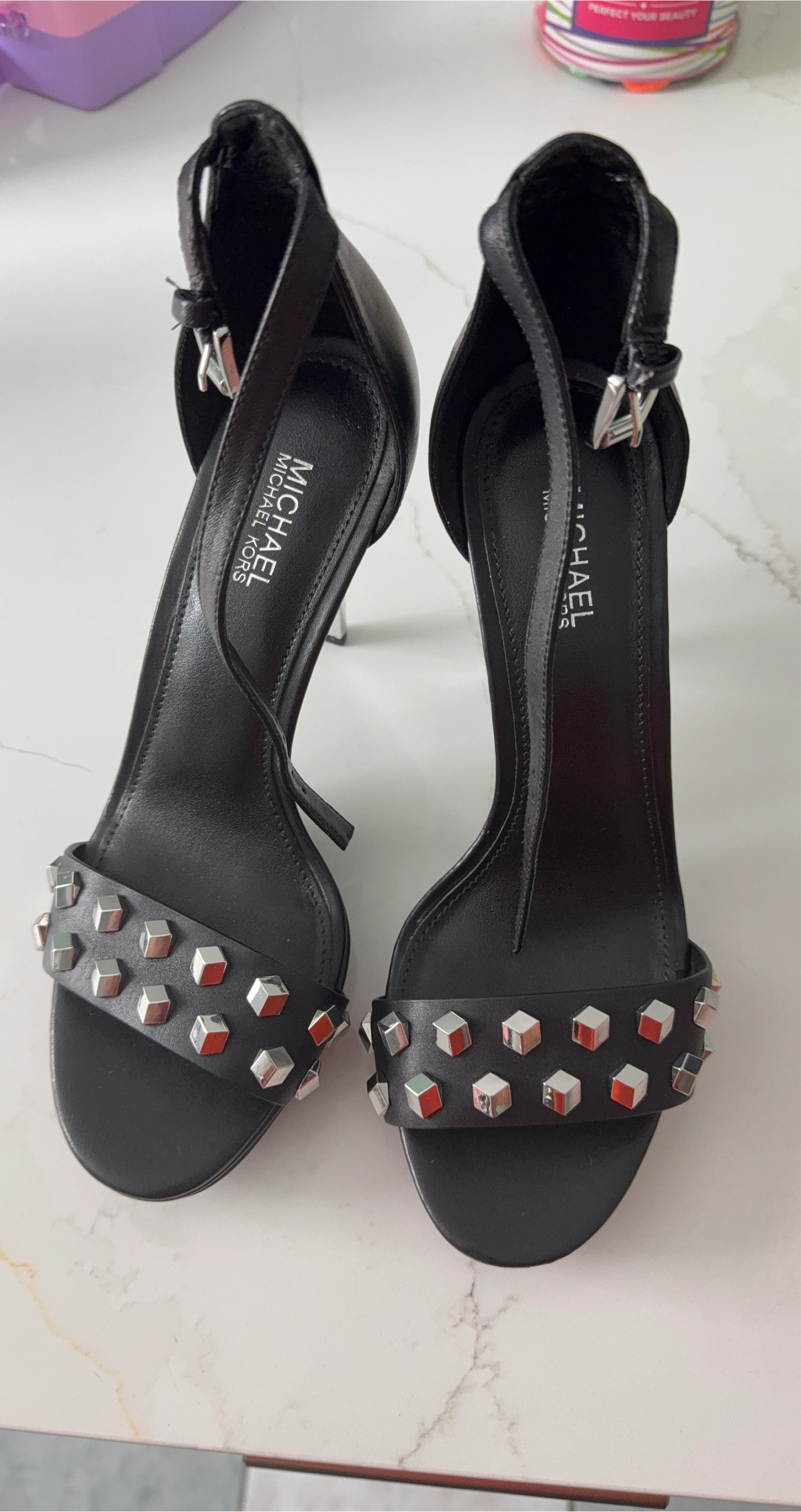 Selling a pair of Michael Kors black heels. They have a studded design on the front strap and a sleek, classic look. Perfect for dressing up any outfit!