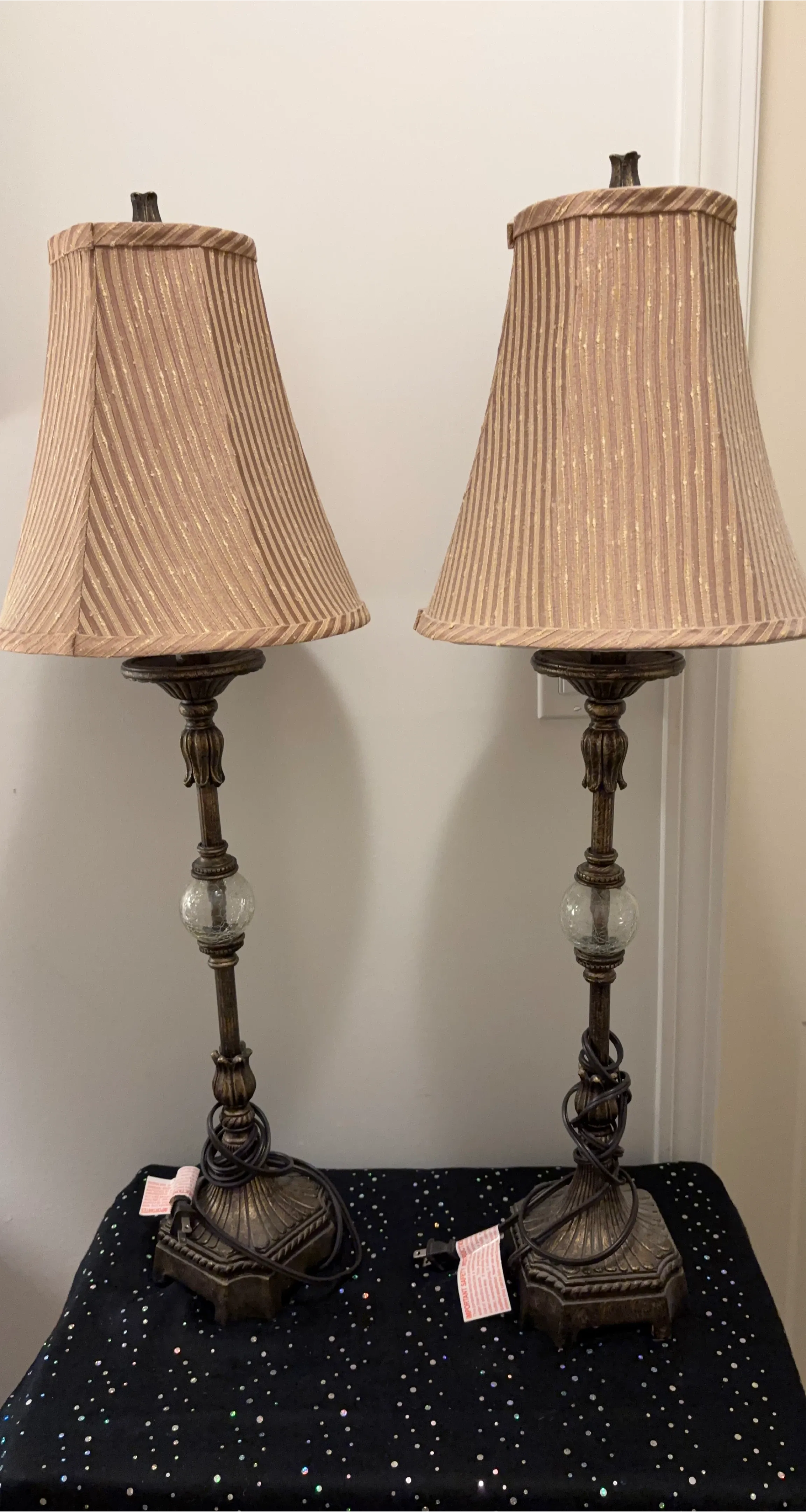 Selling a pair of table lamps that would look great in any room! They feature a bronze-coloured base with a decorative glass ball accent. The lampshades are a tan/beige colour with a subtle striped pattern. They're in great condition and ready to brighten up your space