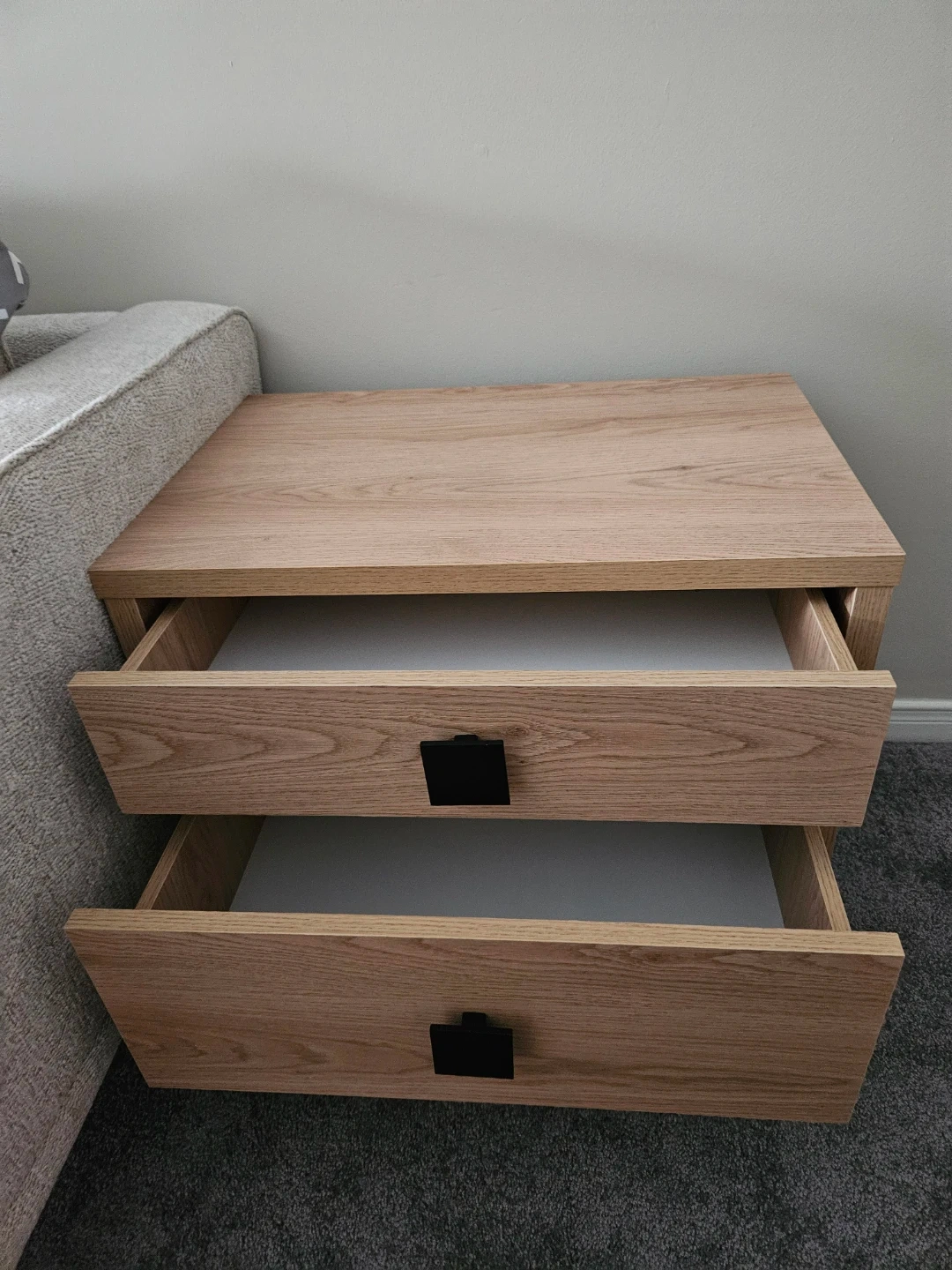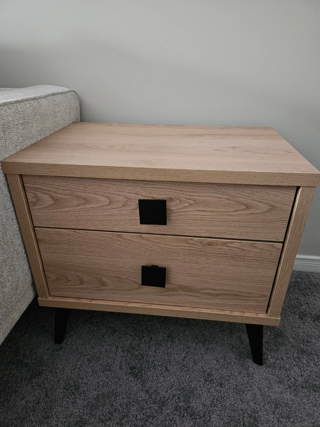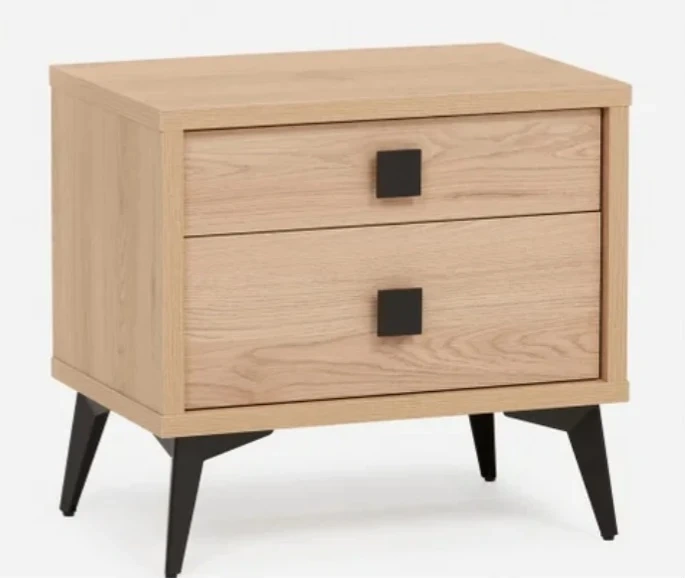 Selling a lovely oak wood nightstand with two drawers. It features a modern design with black square drawer pulls and sleek black legs.