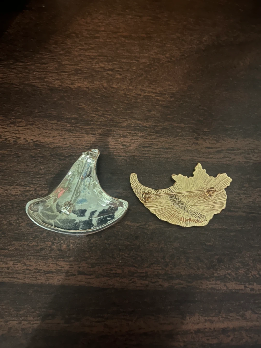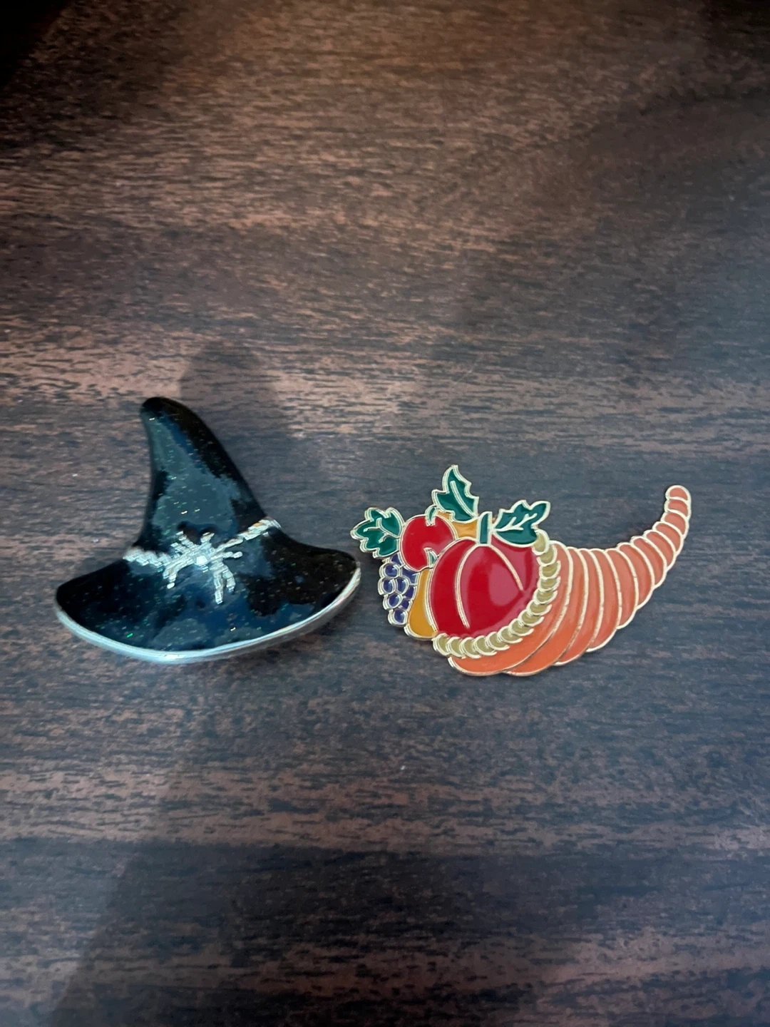 Selling two pins. One is a witch hat with a spiderweb and the other is a cornucopia. Both are in great new condition