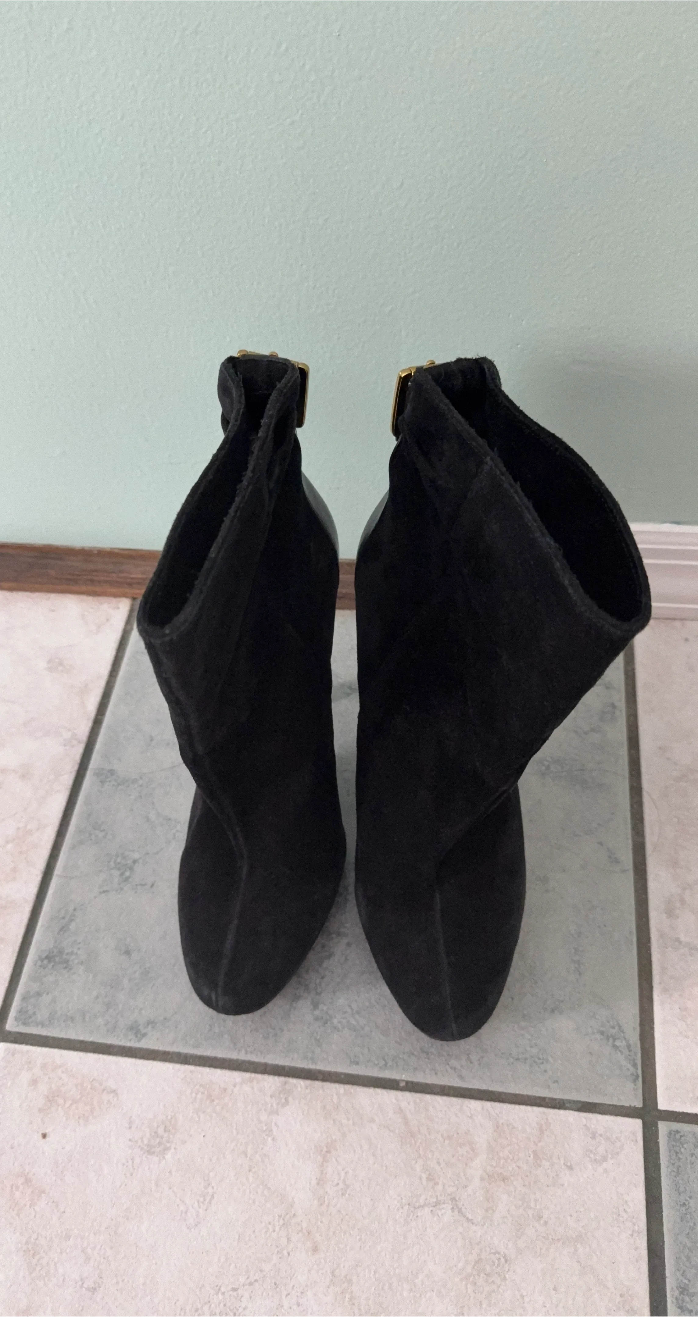 These are a pair of black suede ankle boots. They look to be in good condition and ready for a new owner!
