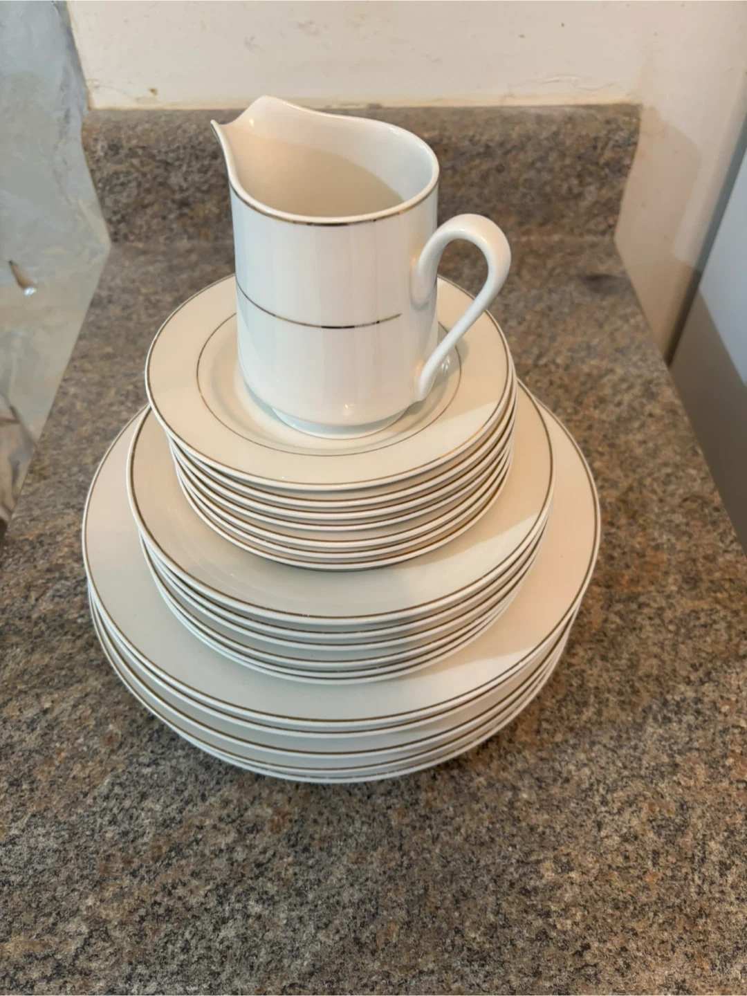 Selling a dinnerware set that includes a creamer. The set is white with a gold trim, adding a touch of elegance to your dining experience. Perfect for everyday use or special occasions!