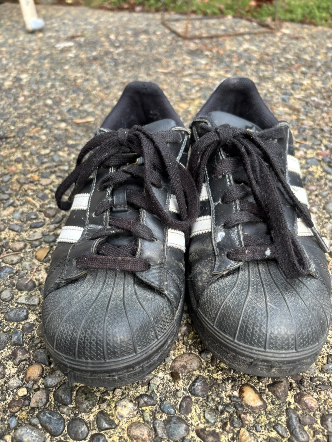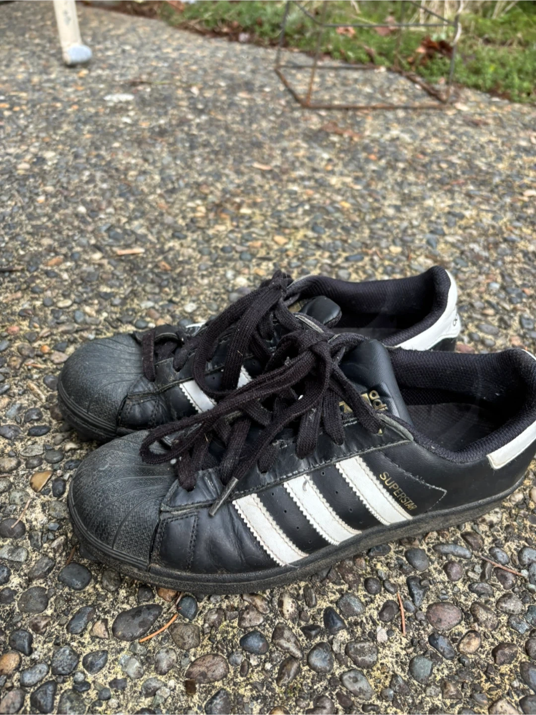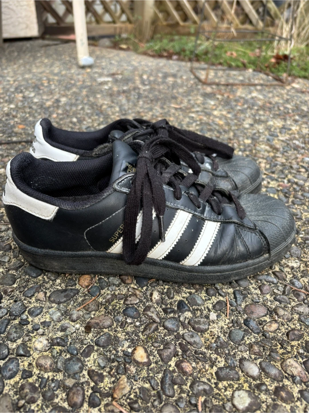 Selling a pair of Adidas Superstar sneakers in black with white stripes. They show signs of wear, but still have plenty of life left!