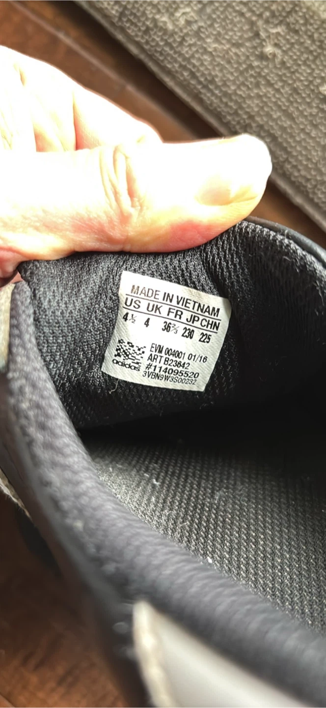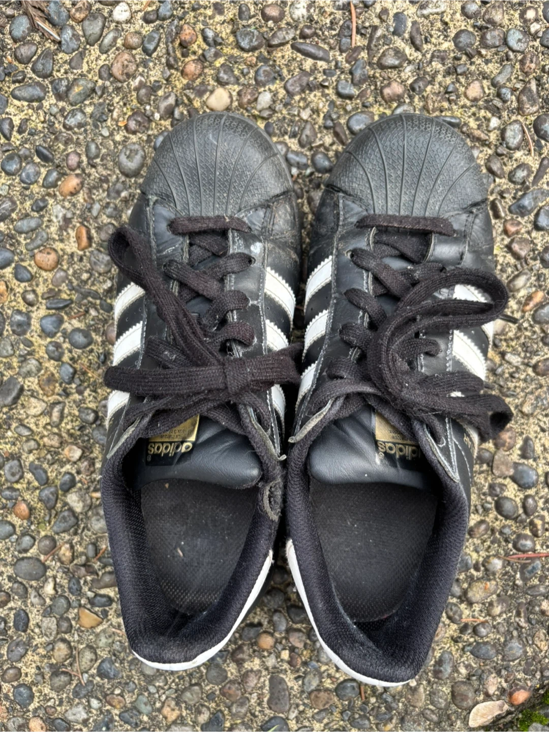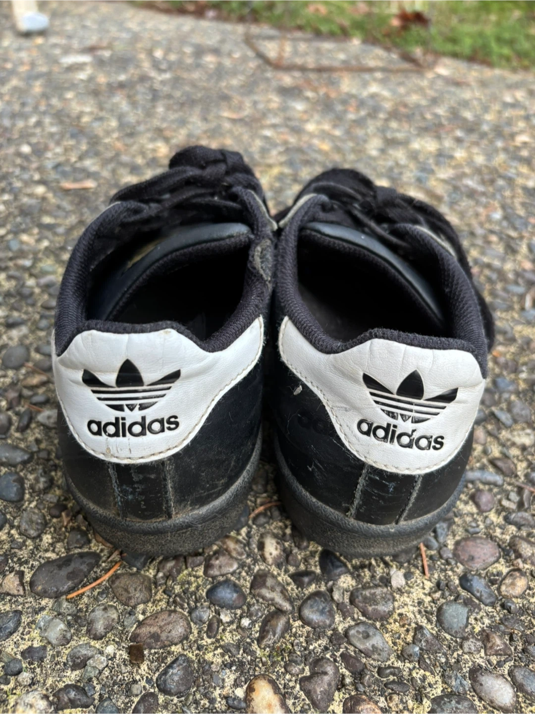 Selling a pair of Adidas Superstar sneakers in black with white stripes. They show signs of wear, but still have plenty of life left!