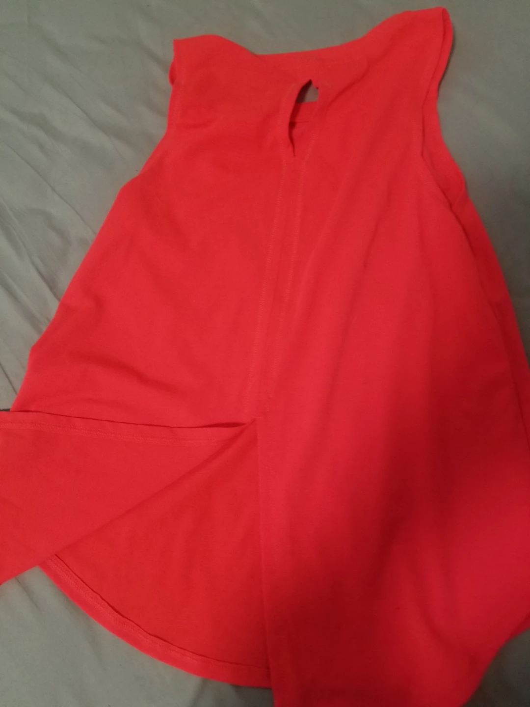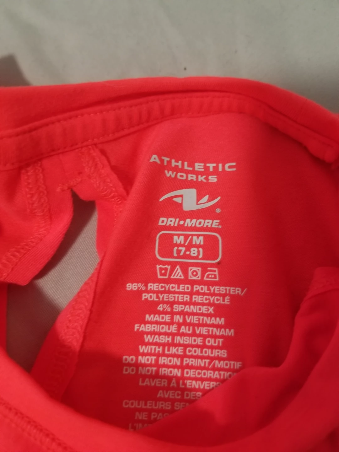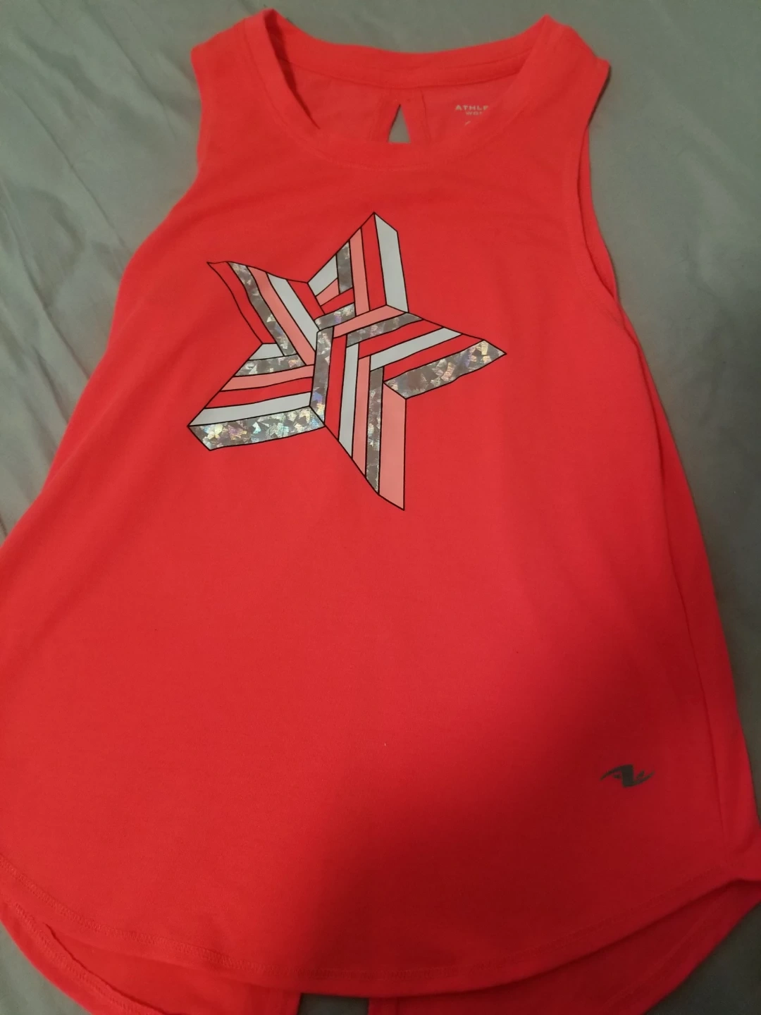 This is a bright coral Athletic Works tank top for girls. It's a size M (7-8) and made from 96% recycled polyester and 4% spandex. It features a cool star design on the front and a stylish open back detail