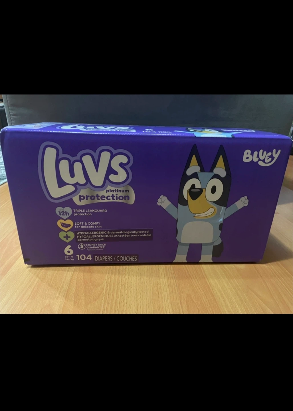 Selling a box of Luvs Platinum Protection diapers featuring Bluey! These are size 6, suitable for babies 16+ kg, and the box contains 104 diapers/couches. Perfect for keeping your little one comfy and dry!