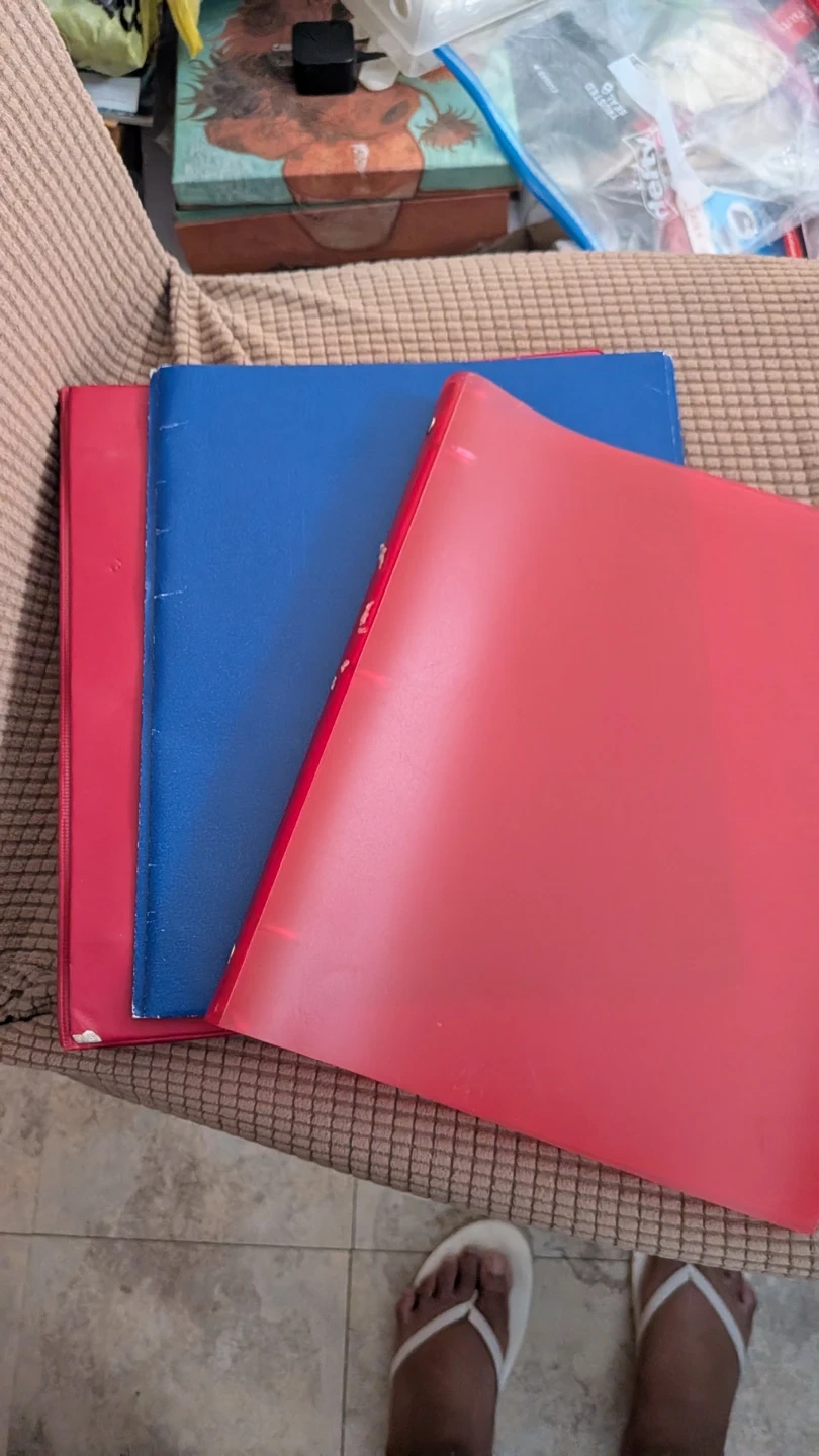 Giving away three ring binders in red and blue colors. They show some signs of use, as pictured.