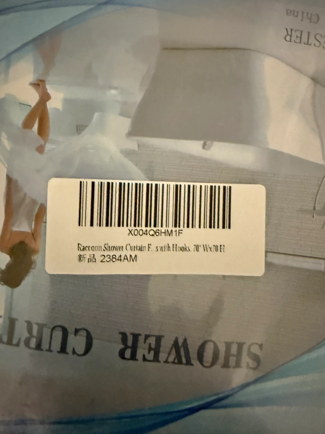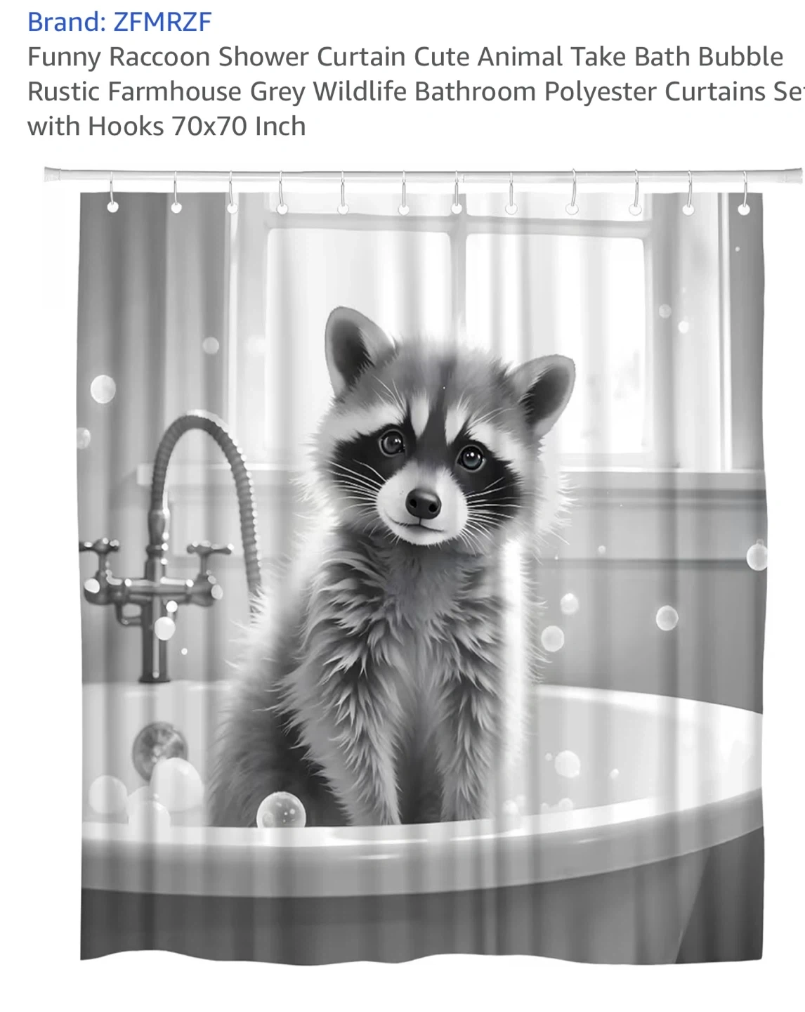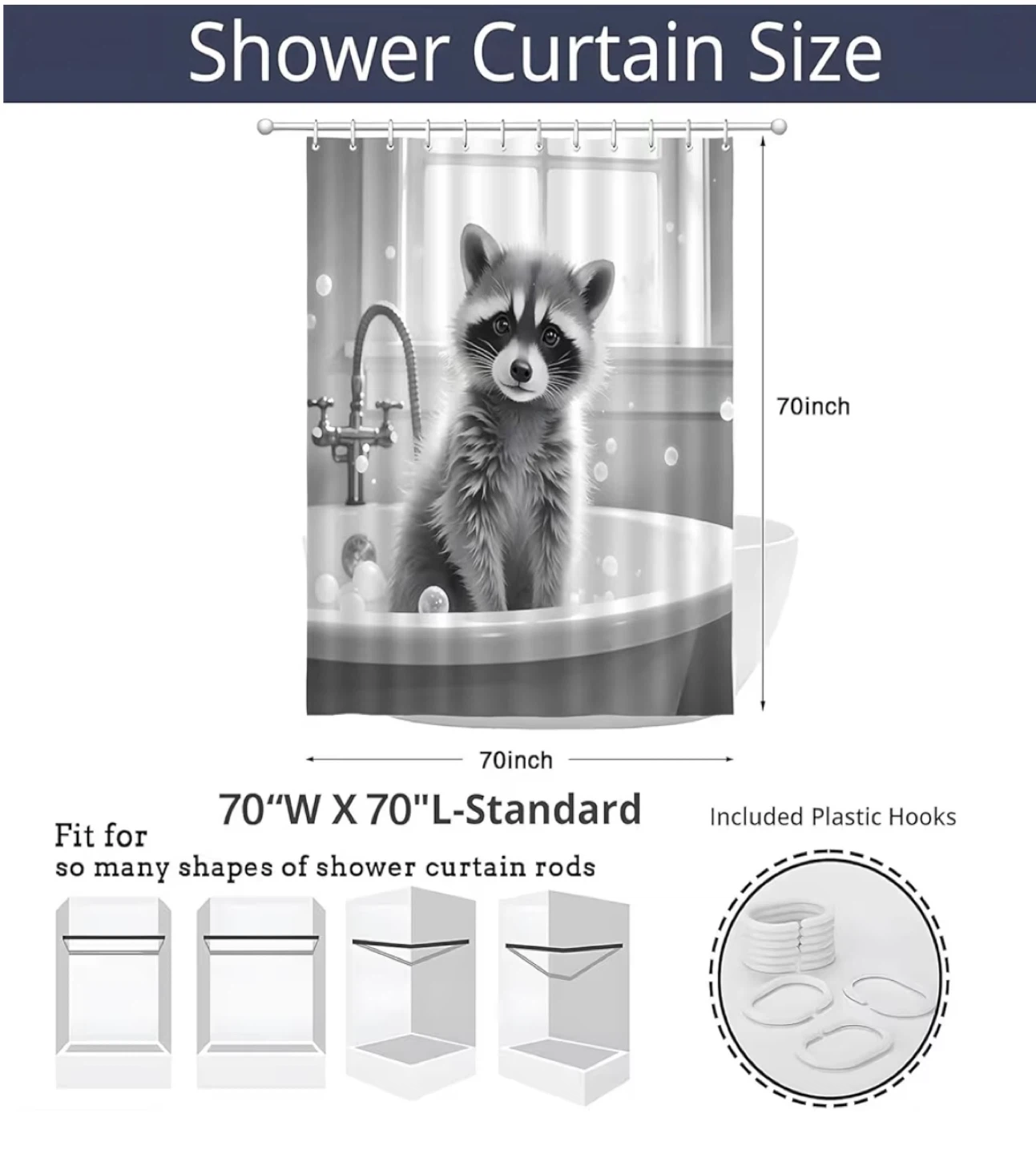 A brand new shower curtain featuring a cute raccoon taking a bath! It's made of polyester and measures 70"W x 70"L, a standard size for most shower curtain rods