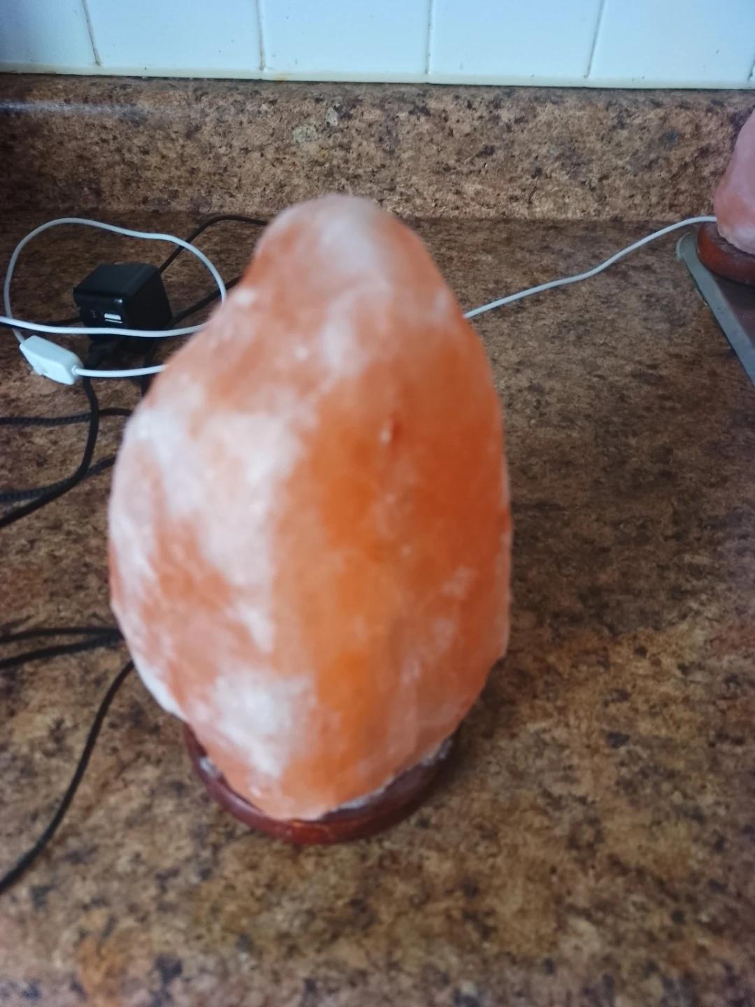 Here's a Himalayan salt lamp that creates a warm and relaxing glow! It comes with its charger so you can easily plug it in and enjoy the soothing light. It's in great condition and ready to brighten up your space