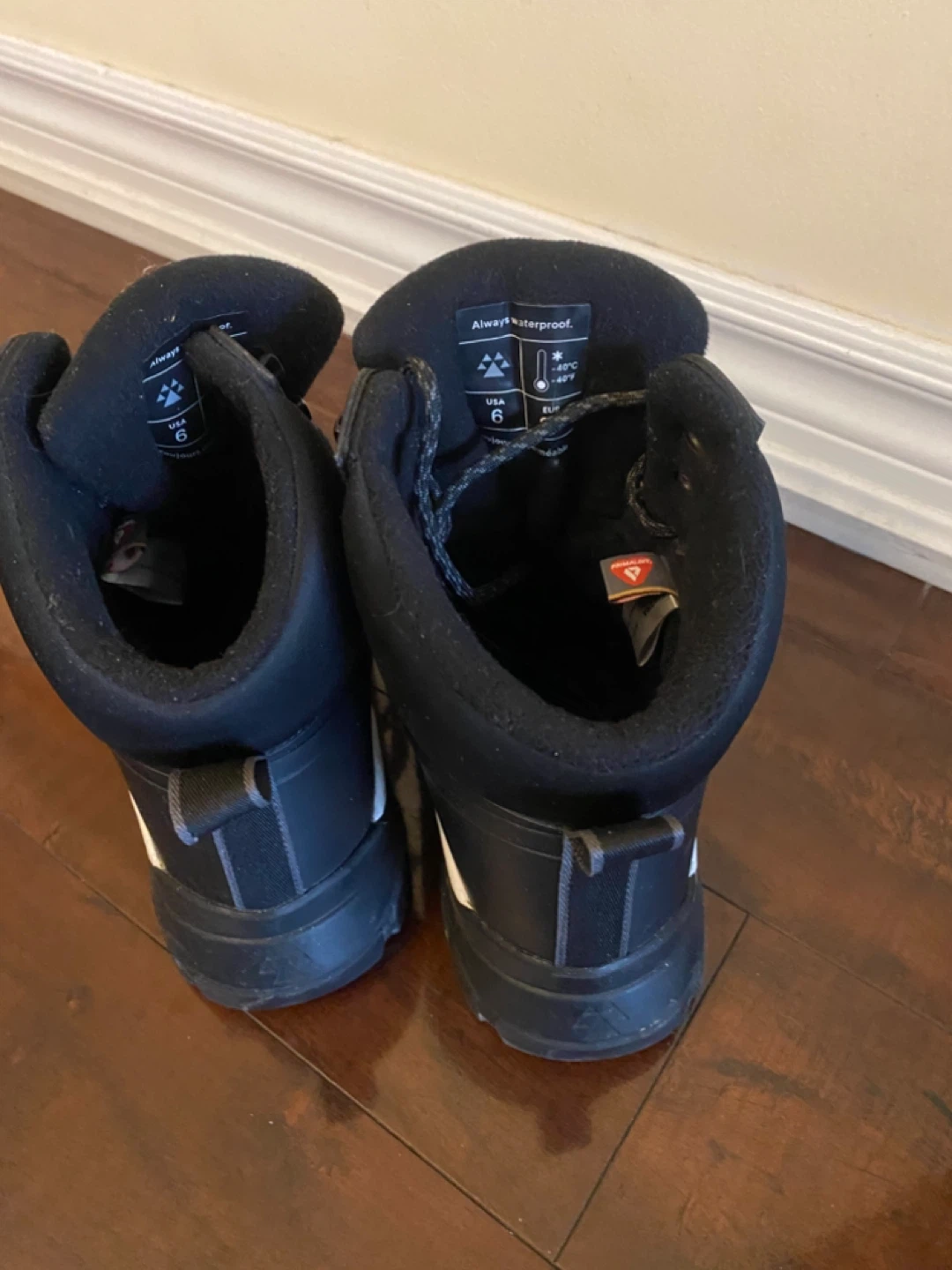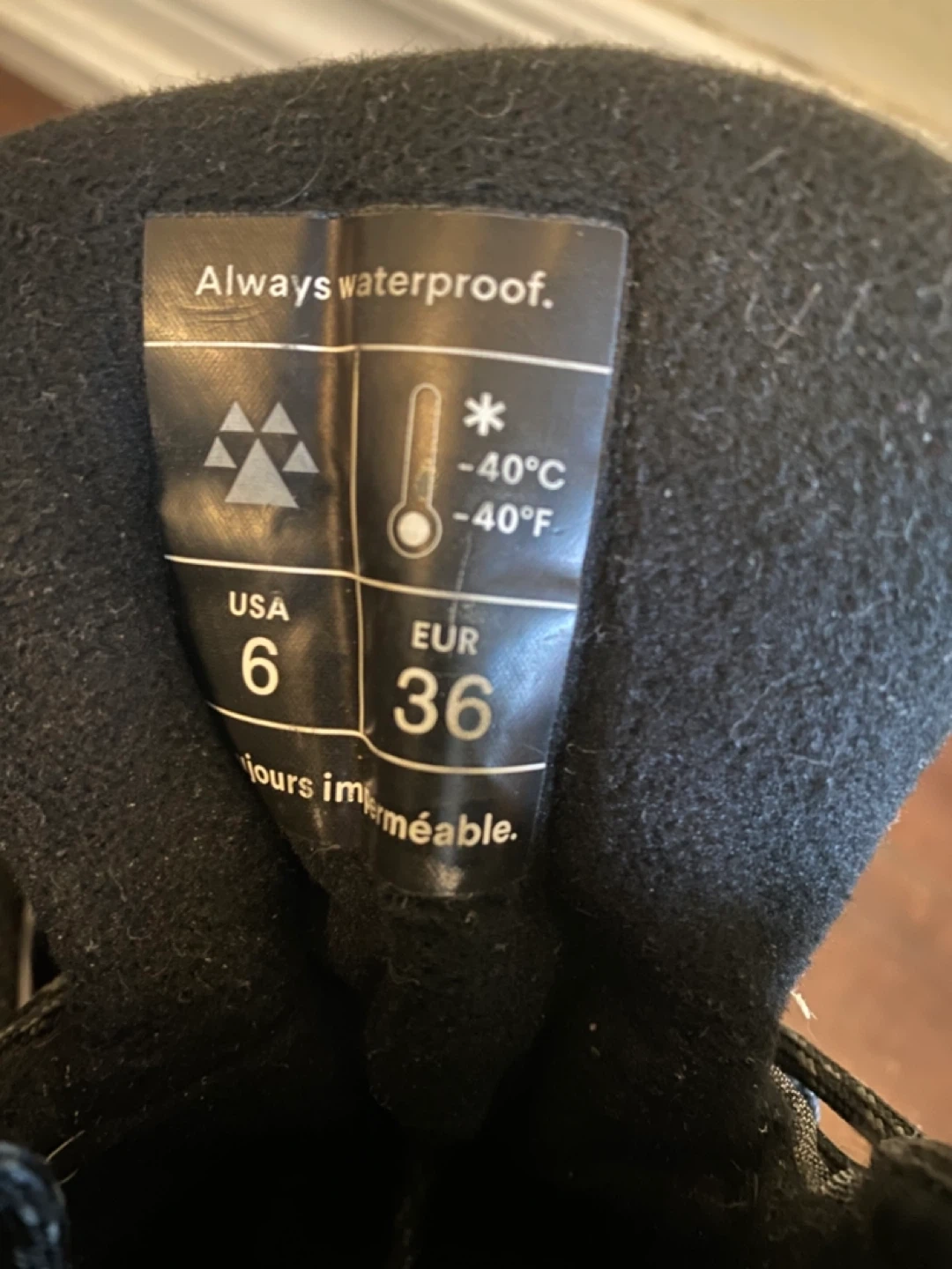 Selling a pair of waterproof winter boots in women's size 6 (US). They're marked as being waterproof and suitable for temperatures down to -40°C/ -40°F. The soles are made by Michelin.