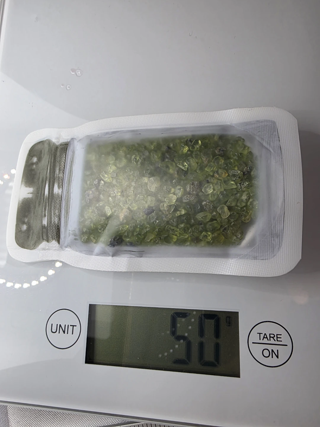 Here's a bag of peridot raw crystal. It weighs 50g. I do have more available.