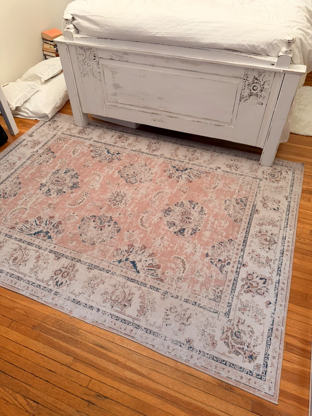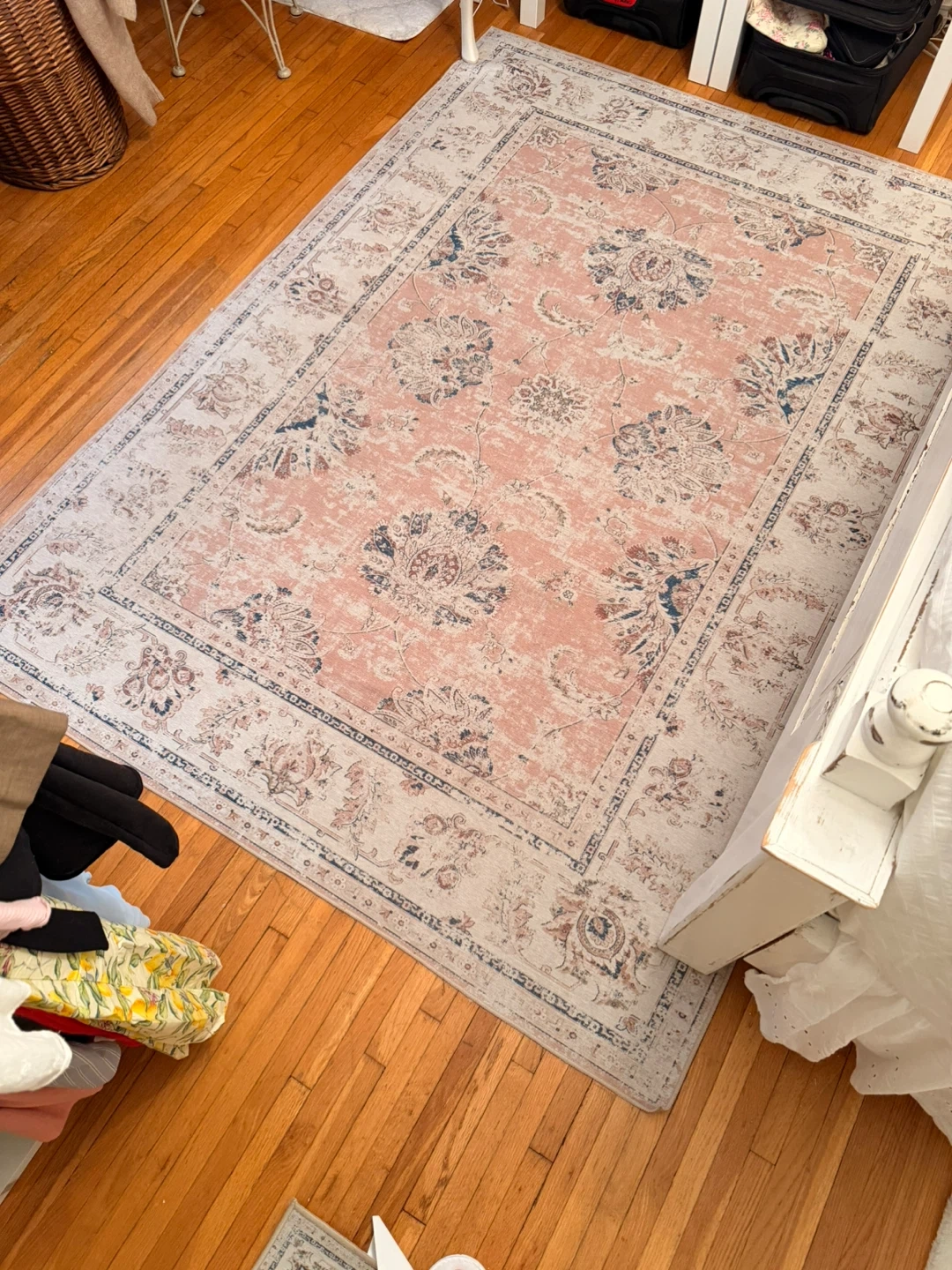 Willing to sell all 3 for $40 for fast sell. Selling a 1 5x7 area rug, perfect for adding a touch of boho charm to your space! It's a light pink, thin entryway mat that's machine washable. Purchased on Amazon, changing my colour scheme. All in good shape. All measurements in the screenshots.