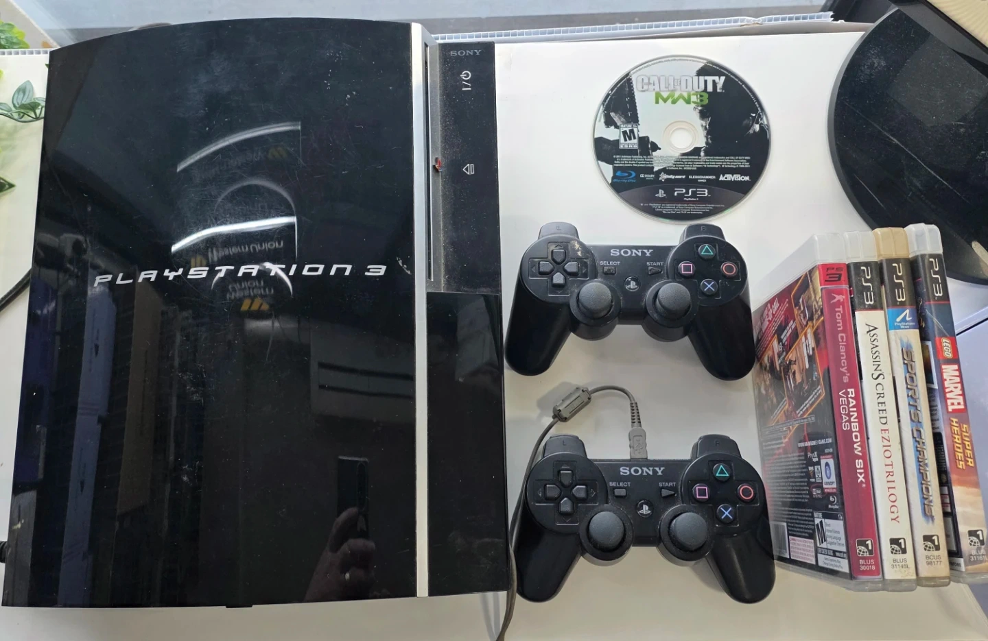 Selling a used Sony PlayStation 3. NOT WORKING It turns on, takes (and ejects) discs but doesn't display the video on tv. It comes with two controllers and several games including Call of Duty: Modern Warfare 3, Tom Clancy's Rainbow Six Vegas 2, Assassin's Creed Ezio Trilogy, Sports Champions, and Lego Marvel Super Heroes