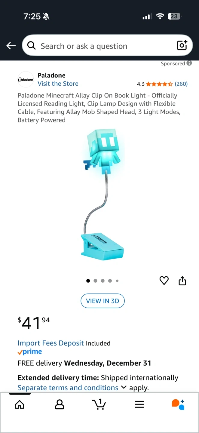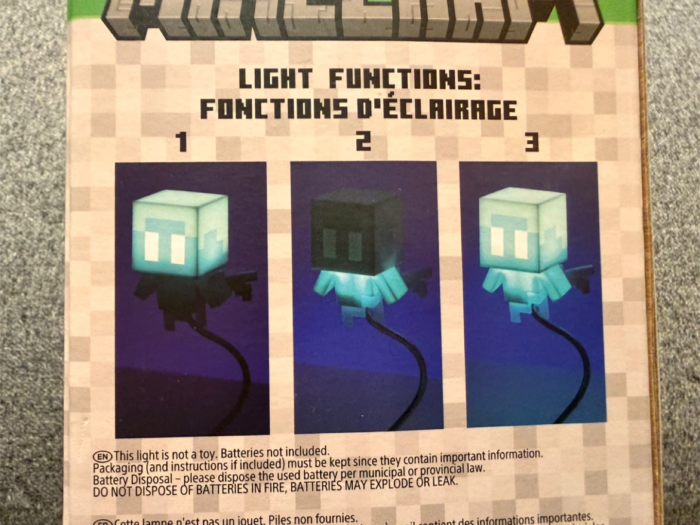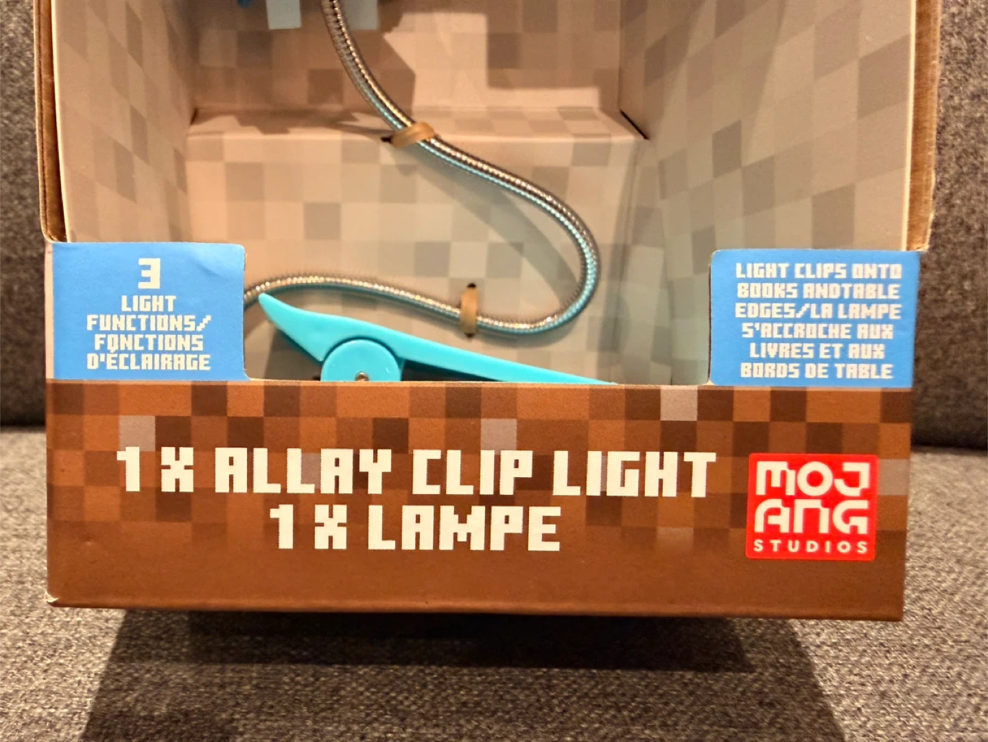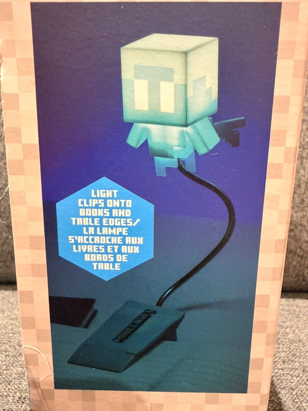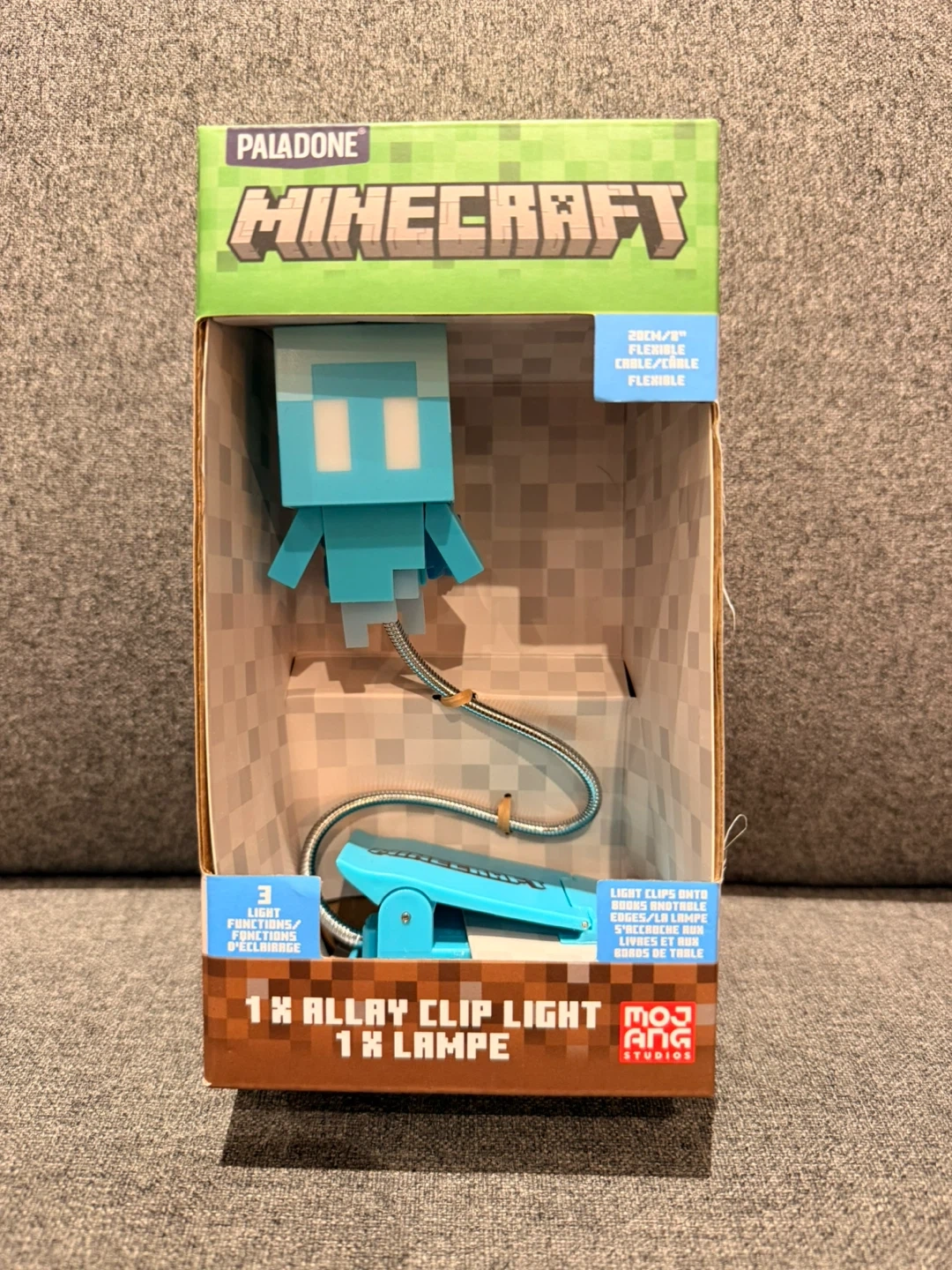 Here's a Minecraft Allay clip-on book light by Paladone! It clips onto books and table edges. The cable is flexible, and it has 3 light modes. Hard to find and perfect for any Minecraft fans.