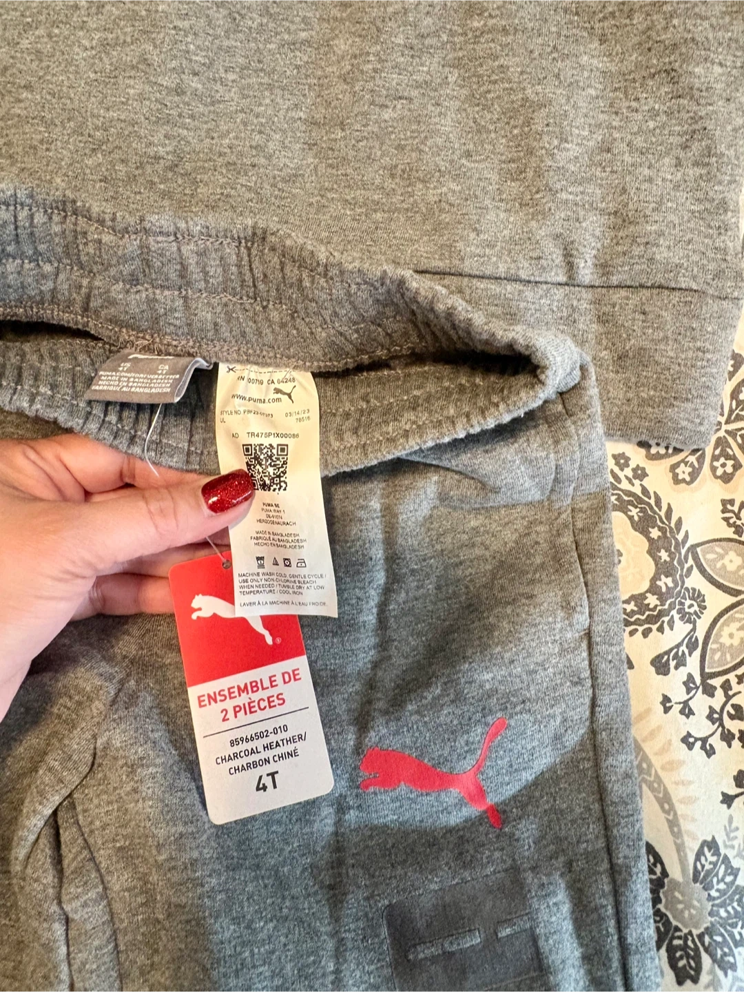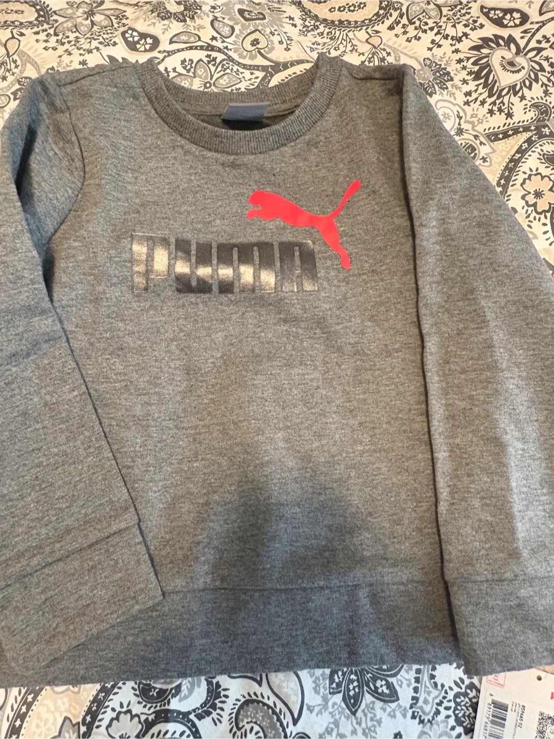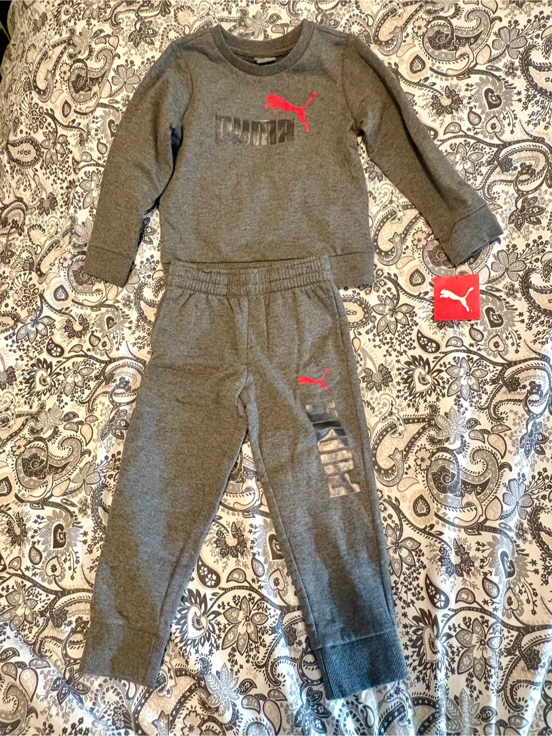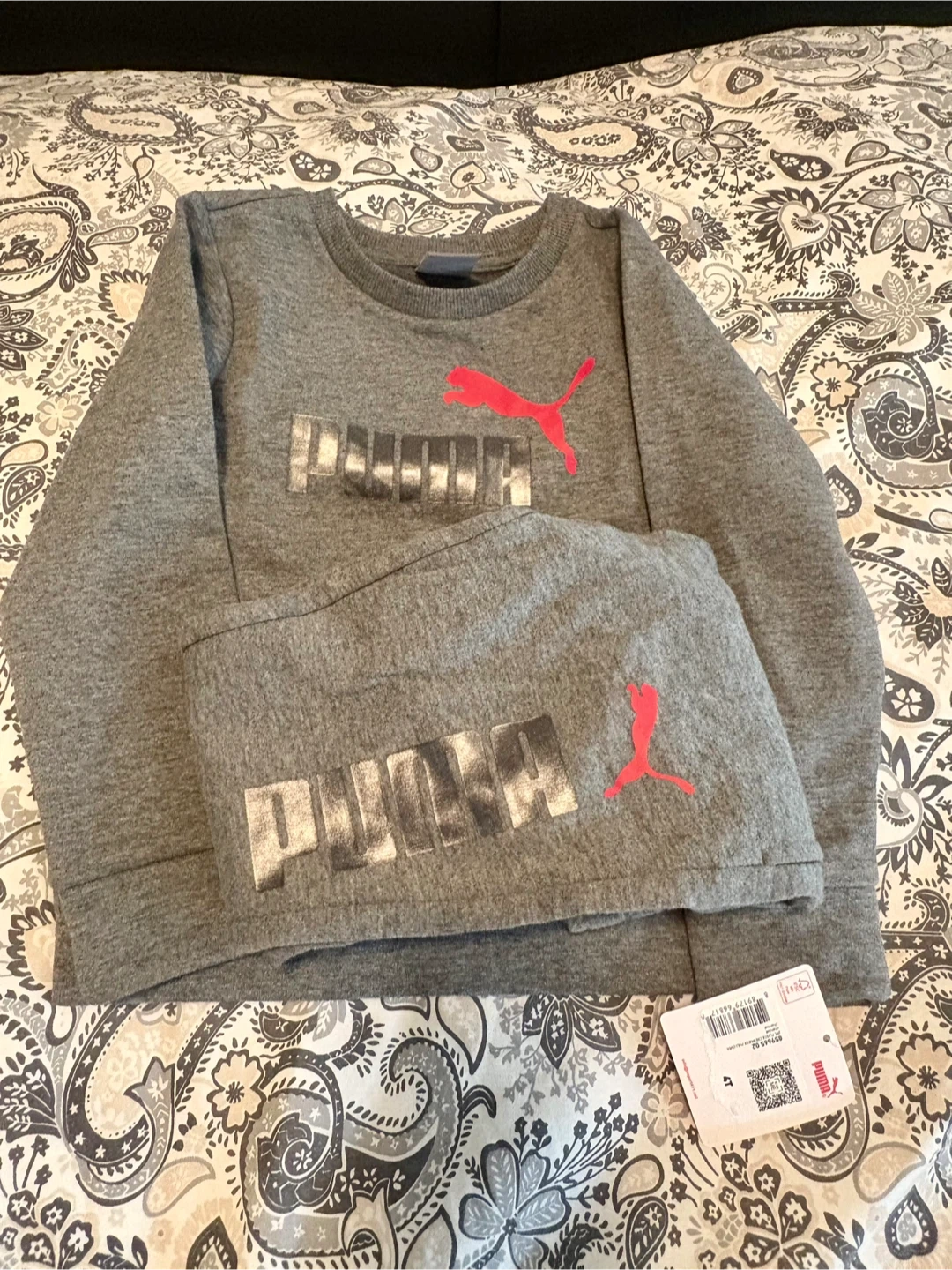 Selling brand new (never worn) a cute Puma two-piece set for kids! It's a charcoal heather colour and size 4T. The set includes a long-sleeved top and matching pants, both with the Puma logo. Perfect for keeping your little one comfy and stylish!