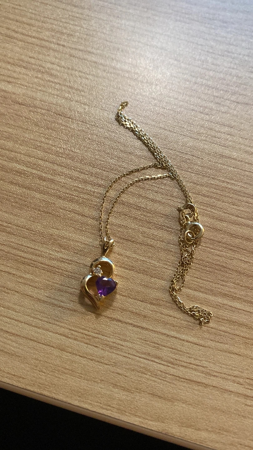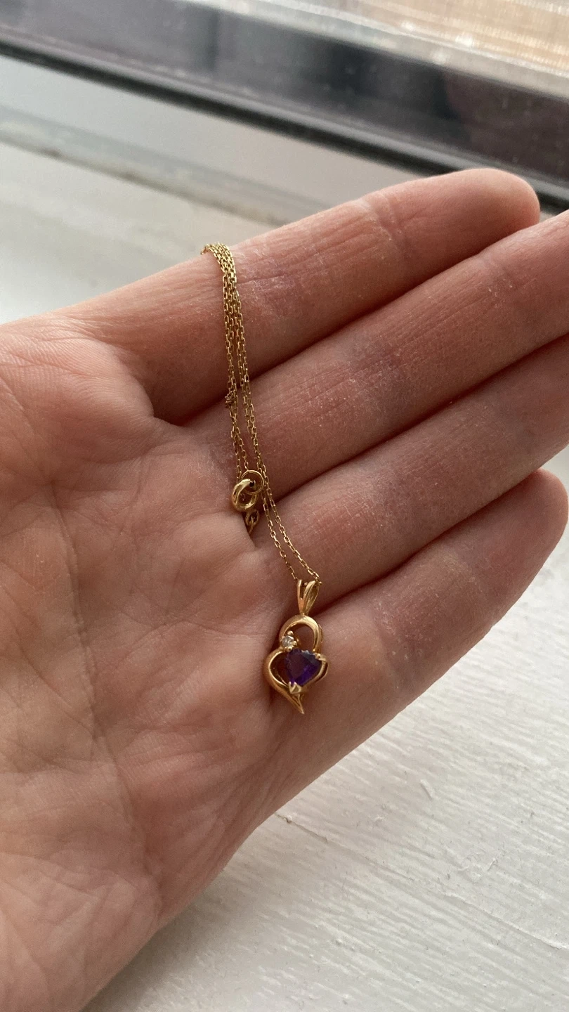 Selling a lovely 14K gold necklace with a heart-shaped pendant featuring a purple amethyst stone and a small diamond accent. The length is 18 inches.