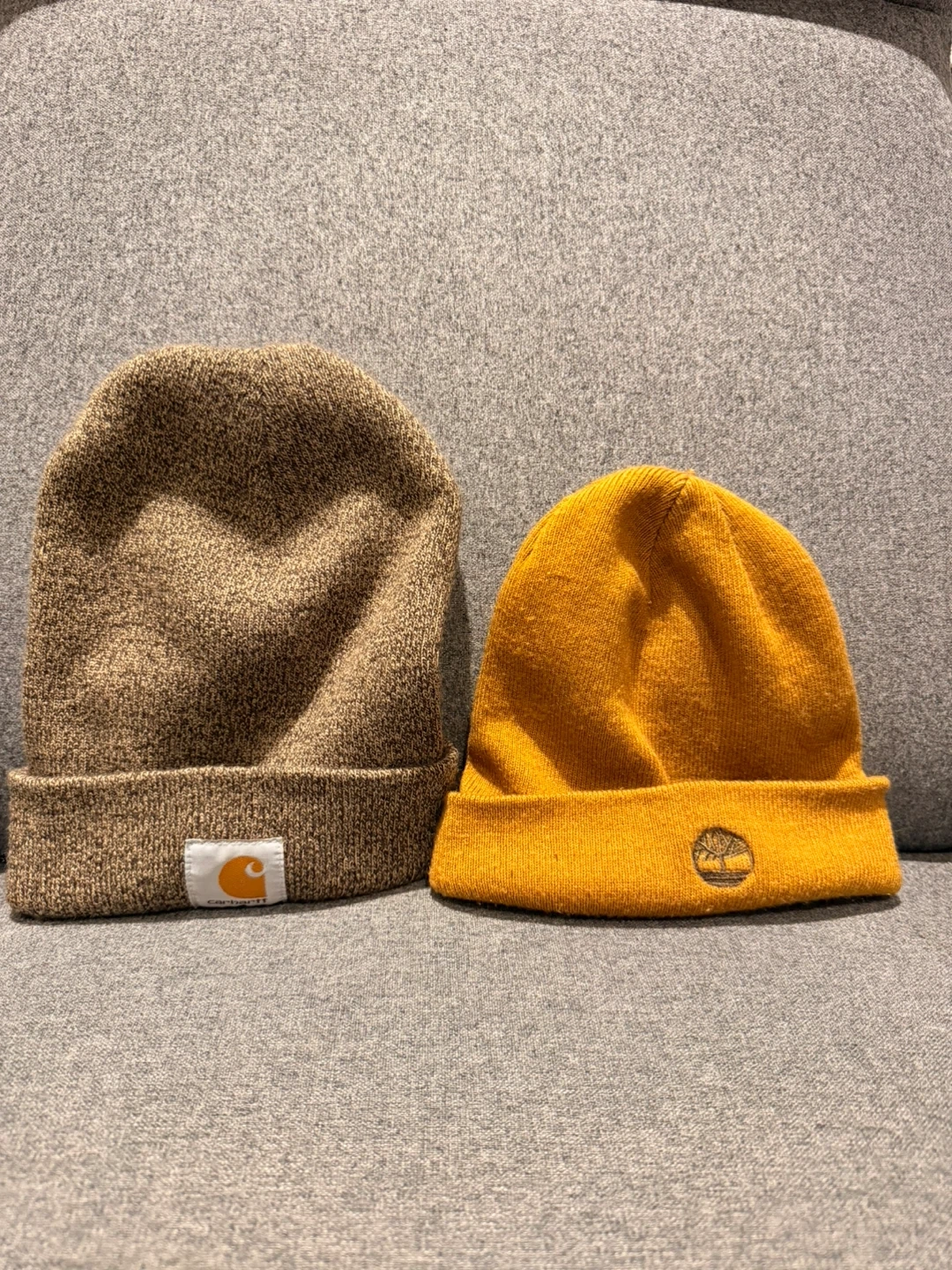 Cozy Carhartt beanie in a neutral brown colour + a Stylist Timberland hat. Both one size fits all. Perfect for keeping your teenager or yourself warm in the winter.